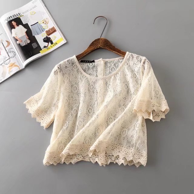 봄과 여름 일본식 달콤한 중공 레이스 셔츠 느슨한 반팔 블라우스 짧은 탑 슬리밍 티셔츠 한국 스타일 여성 의류스토어 가기