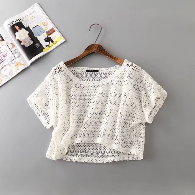 일본식 달콤한 중공 크로 셰 뜨개질 레이스 셔츠 짧은 느슨한 플러스 사이즈 블라우스 반팔 한국 스타일 여성의 최고 자외선 차단제 셔츠스토어 가기