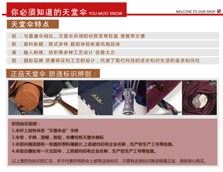 本公司是杭州天堂伞业集团直接授权的总经销商,销售的所有产品都是厂家直接供货正品,并提供完善的售后服务!