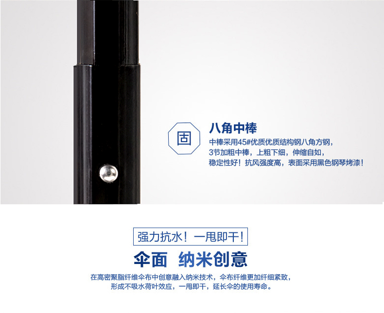 超轻、防紫外线的遮阳伞。本伞伞面具有特殊的防紫外线功能,它是在普通面料上经再次涂覆加强型防紫外线涂料制成