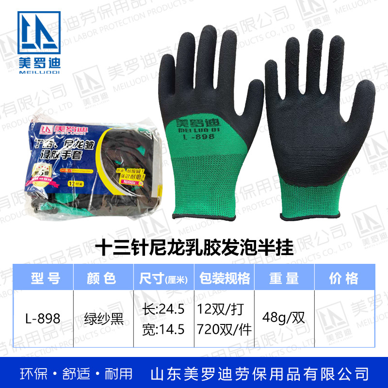 Merodi 898 13 스티치 나일론 녹색 원사 블랙 라텍스 세미 행잉 폼 장갑 노동 보호 장갑 내마모성 및 통기성