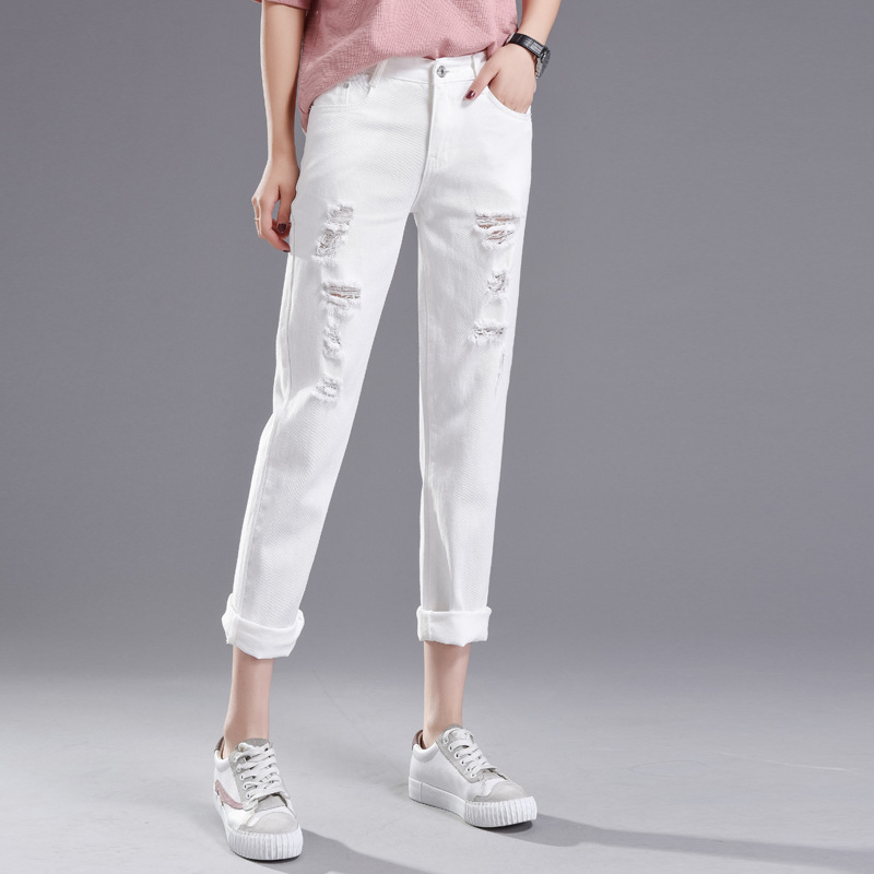 찢어진 청바지 발목 길이 바지 여성용 흑백 느슨한 학생 라이트 bf 거지 바지 봄 뉴 할란 9 길이 바지
