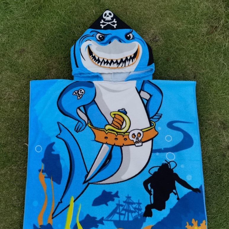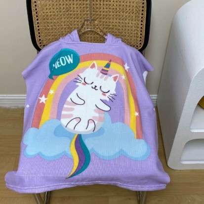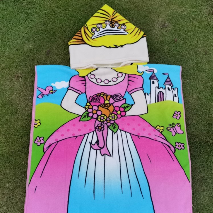 产品特点:儿童连帽浴巾披风斗篷,展开是长方形浴巾,对折成为浴袍,帽子宽口,衣缘折边,卡通印花