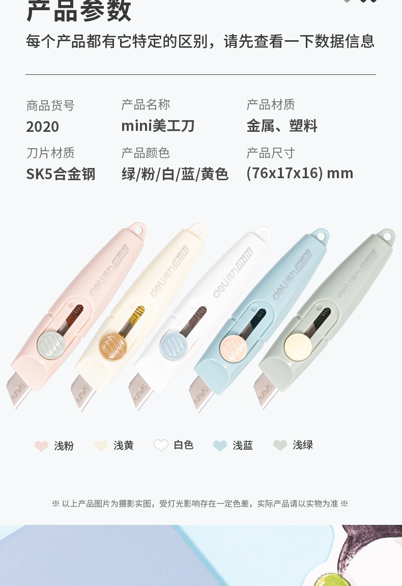델리 2020 아트 나이프 미니 컬러 종이 커터 박스 오프닝 나이프 휴대용 소형 아트 나이프 편지 오프닝 나이프