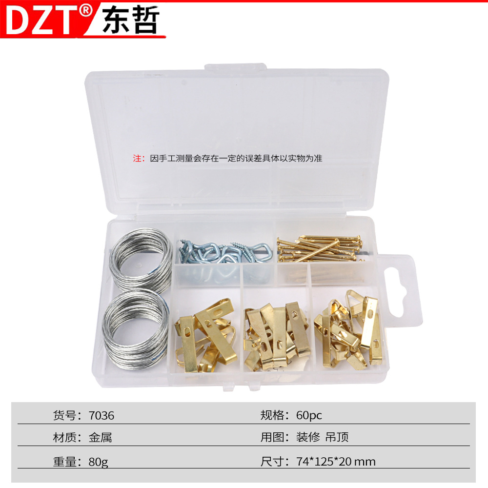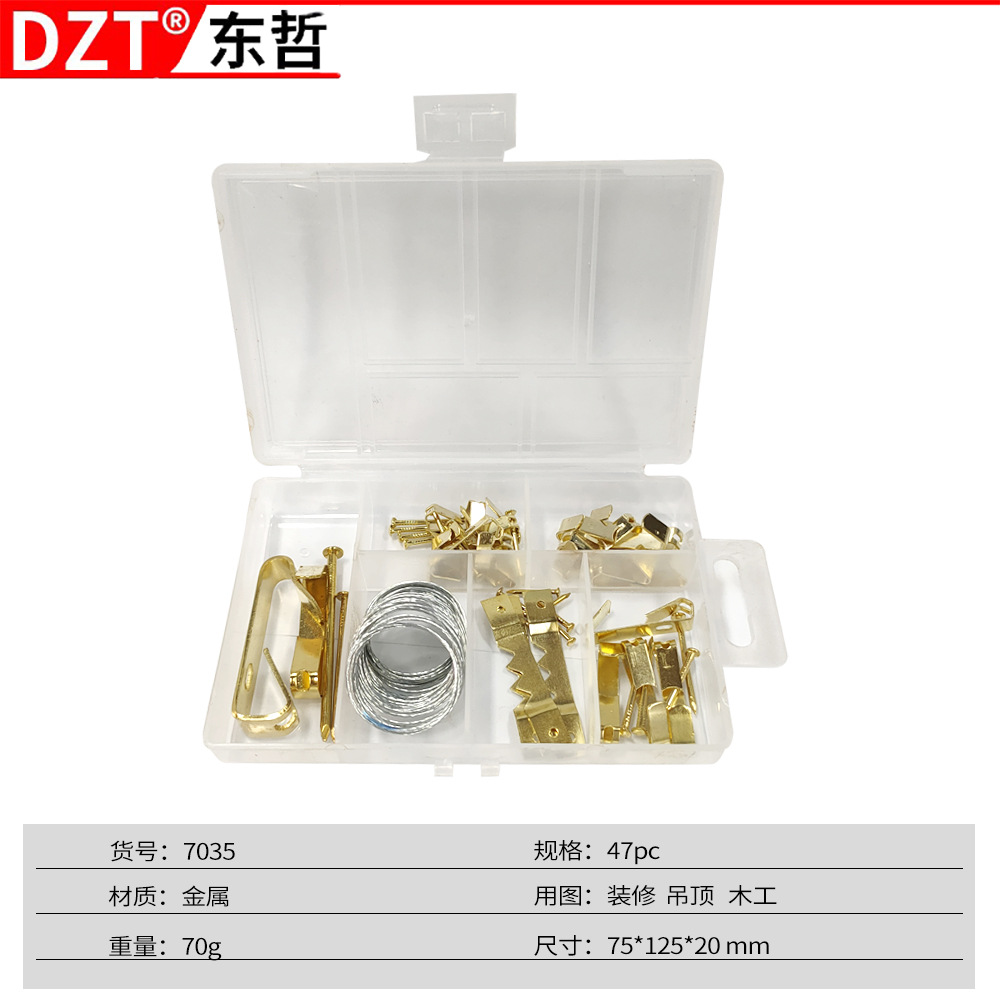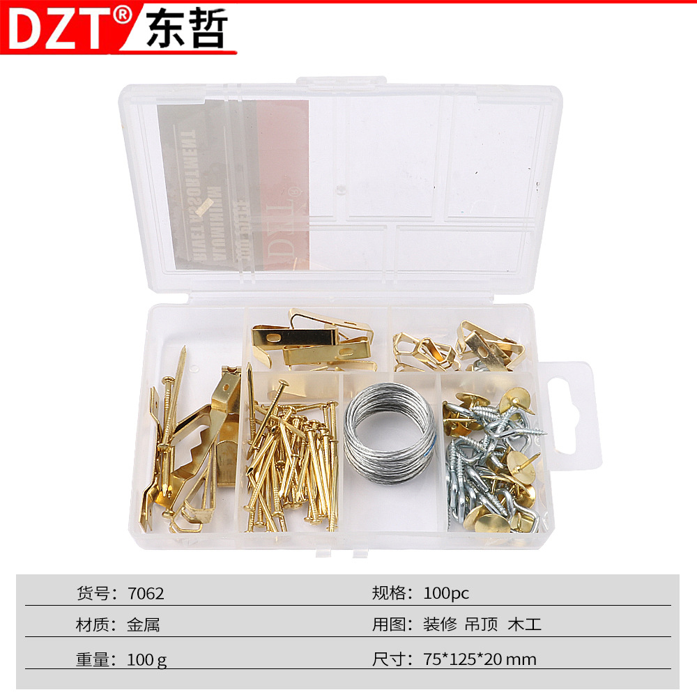 10英尺金属线1根/画框挂齿3个 /0.5"钉子6颗/10LBS画框钩6个/20LBS小画框钩6个/0.75"木钉12颗/30LBS画框钩4个/1"木钉4颗/50LBS大号画框钩1个/1-1/2"木钉1颗/100LBS特大号画框钩1个/2"木钉1颗/ PP盒子1个