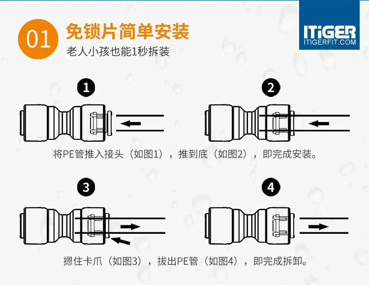 | 1 | PE管配合标准 | 1/4"OD接标准1/4"PE管,3/8"OD接标准3/8"PE管,1/2"OD接标准1/2"PE管 |
