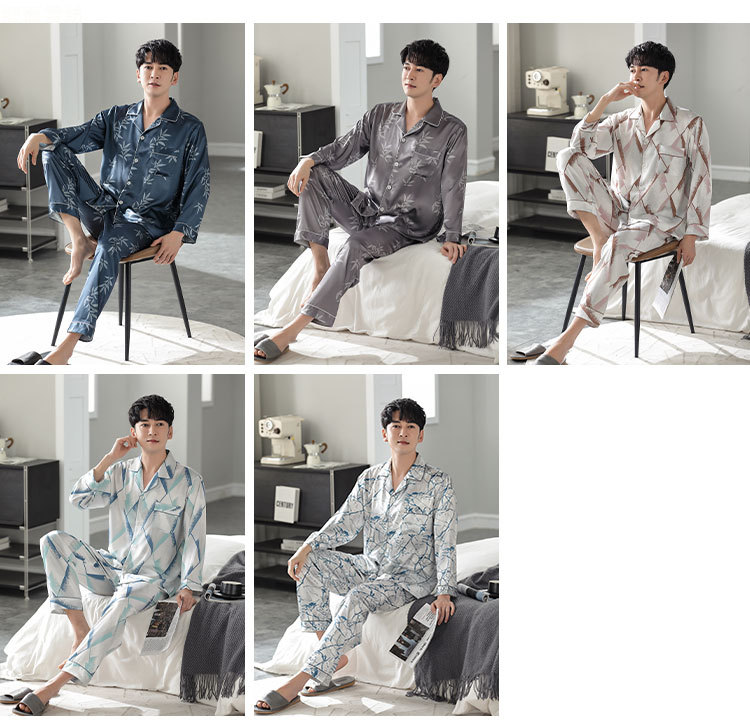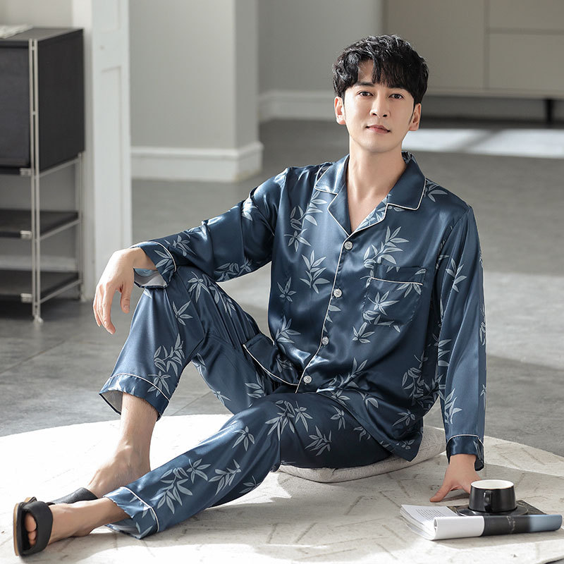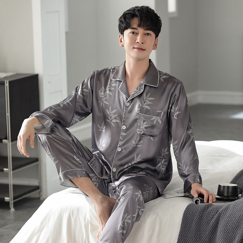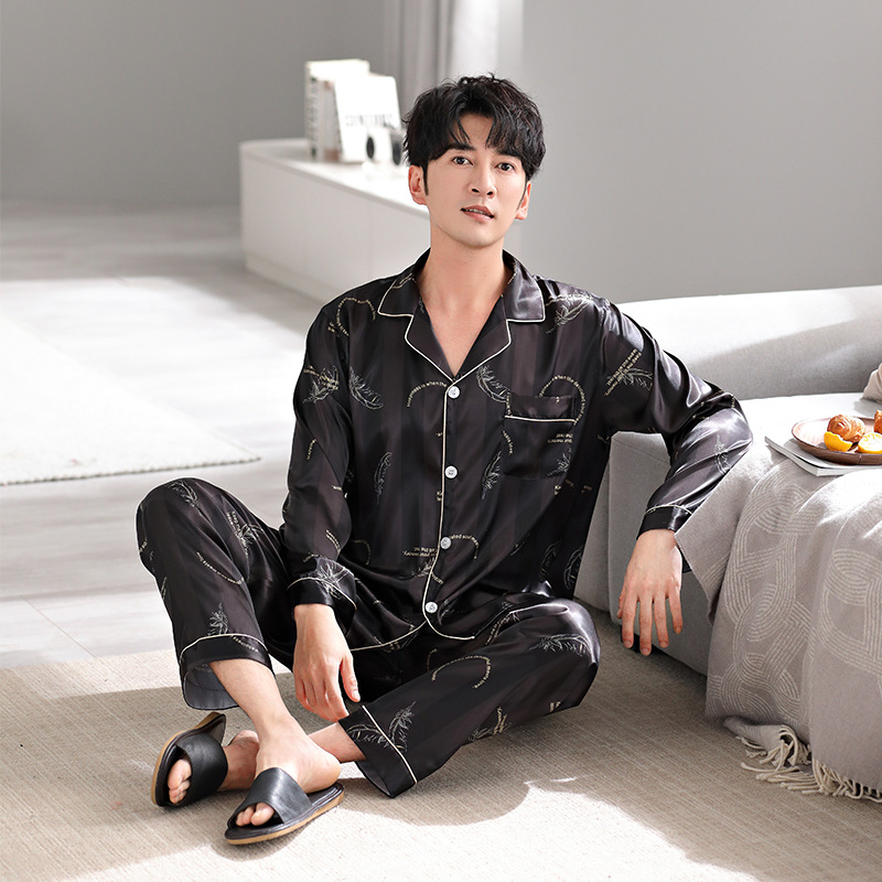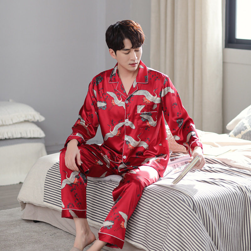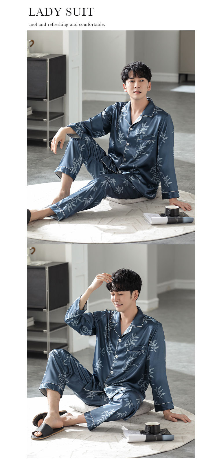 한 Yatong 실크 남자의 잠옷 새로운 봄과 여름 인쇄 실크 세트 가을 여자의 긴 소매 가정 옷
