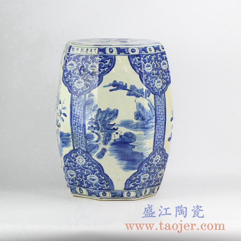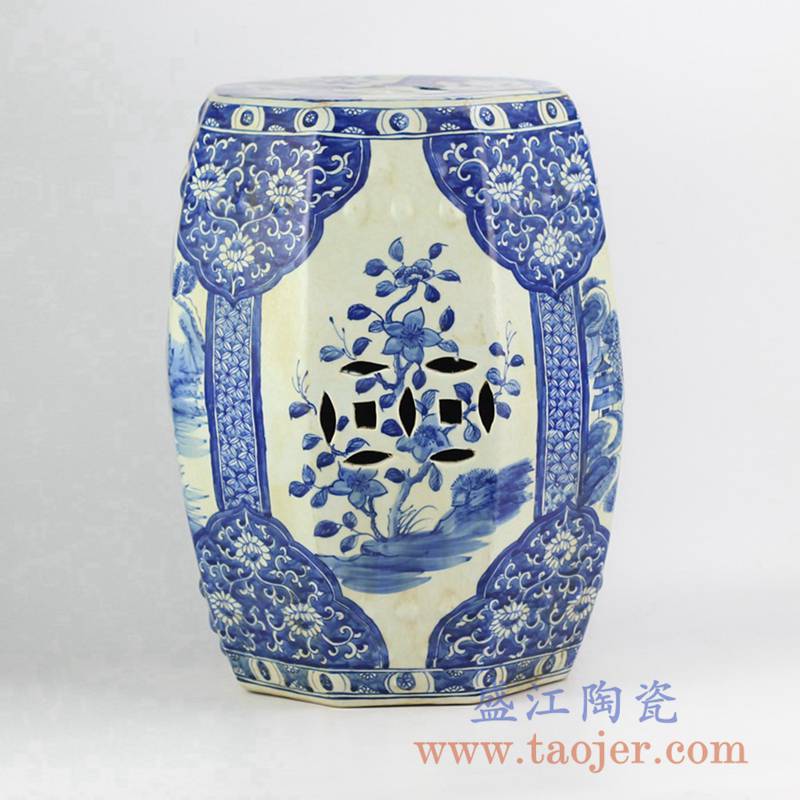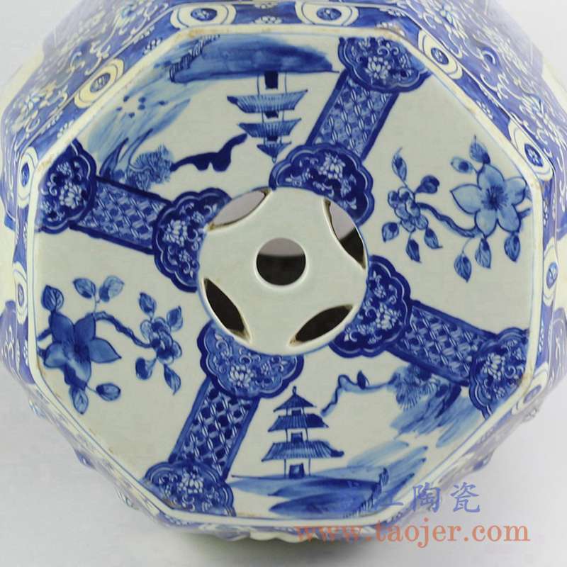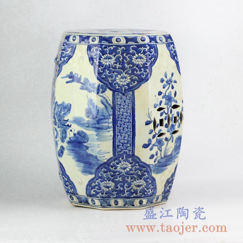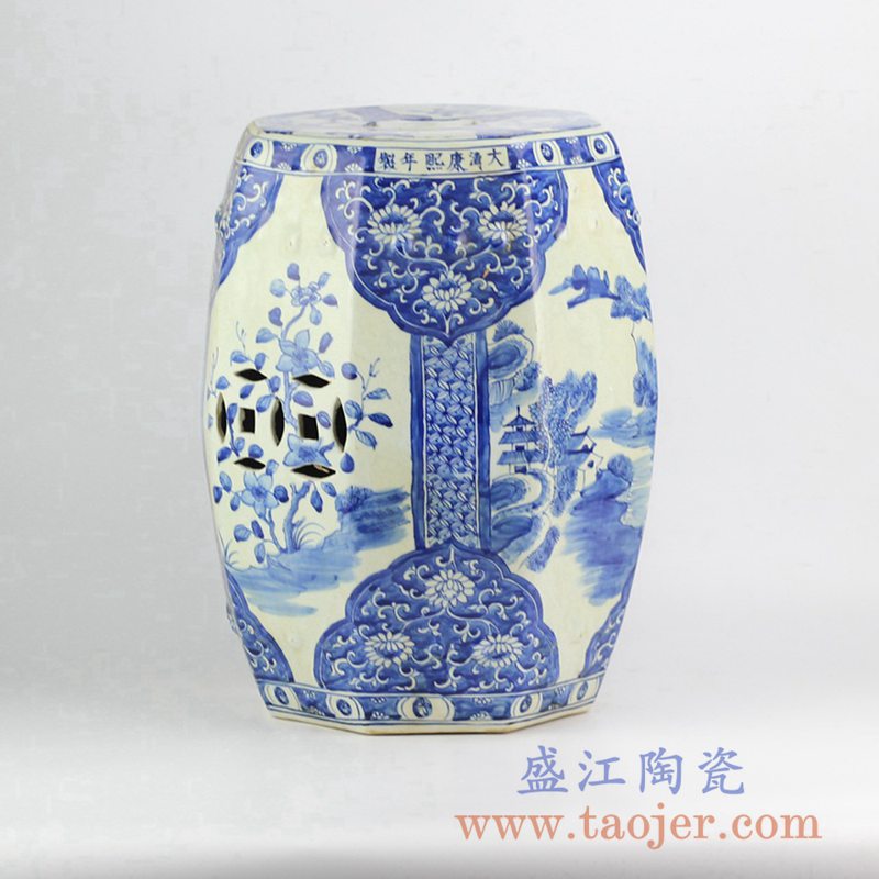 产品名称 :RZKJ01-A 特价青花山水花朵雕刻带铜钱孔凉凳陶瓷墩家居用品创意