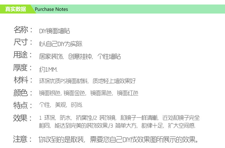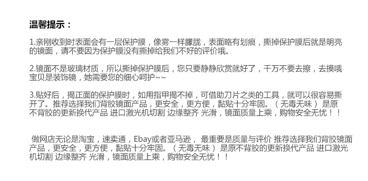 0.1mm厚:PET材质,自带背胶,分别有9片装、16片装(15*15cm的正方形),此款因为材料较薄,扭曲的比较严重,仅仅能作为装饰,不适合作为镜子。