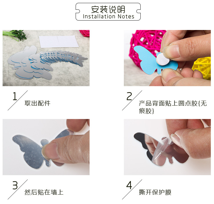 4、若不小心将墙贴贴错位置了,可以用小刀片将墙贴一角轻轻掀起撕下,重新粘贴即可,本产品正常情况下可重复使用,只要不撕坏;