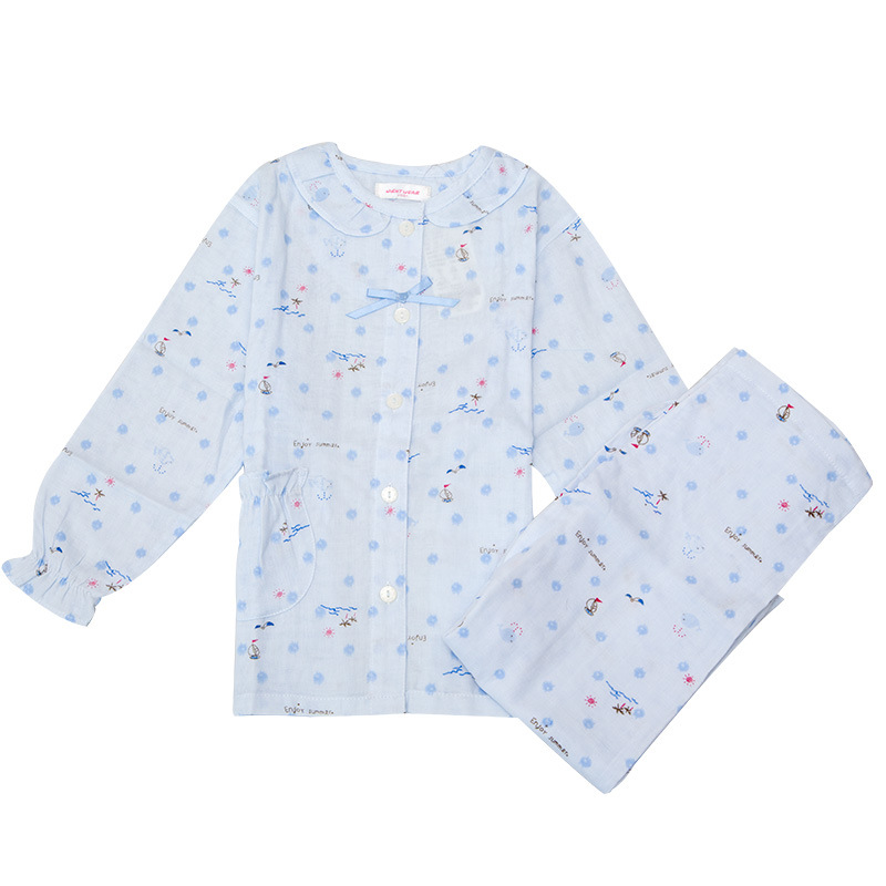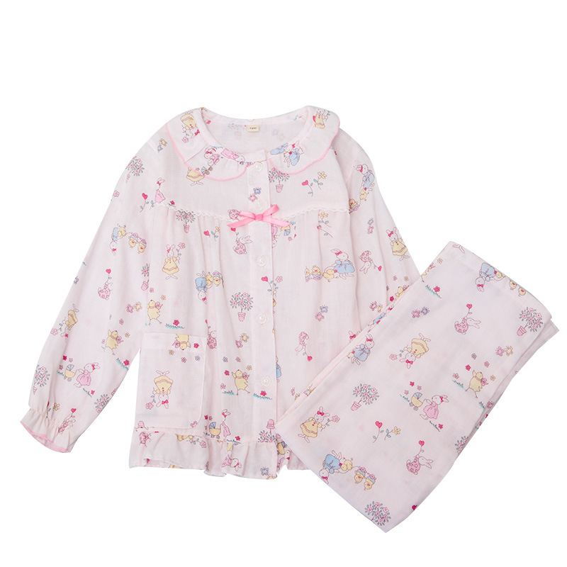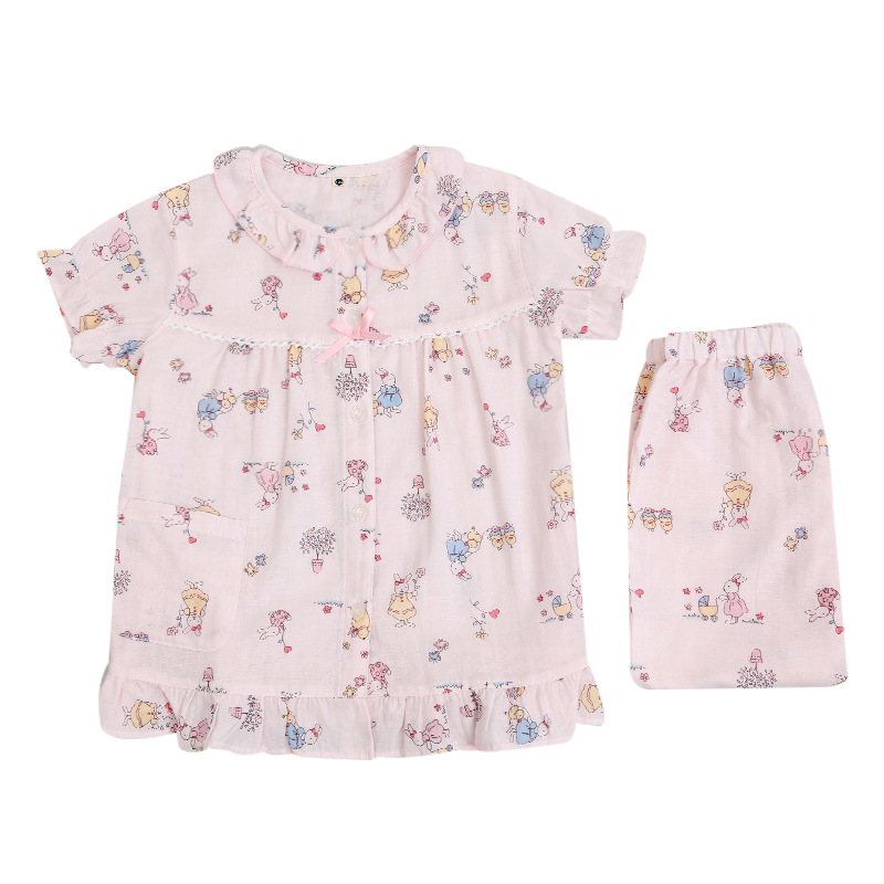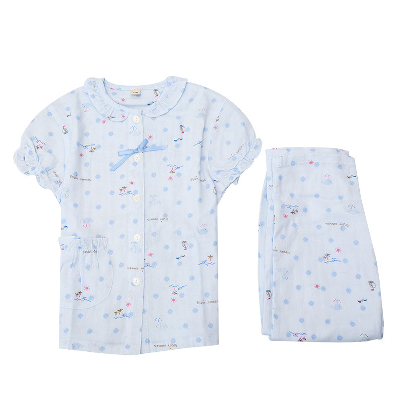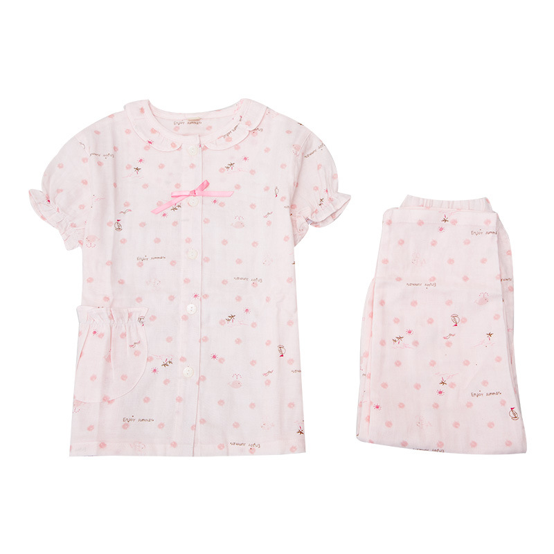 여름 봄과 가을 더블 거즈 반팔 잠옷 세트 여자 가정 옷 귀여운 큰 아이 세대의 머리카락스토어 가기