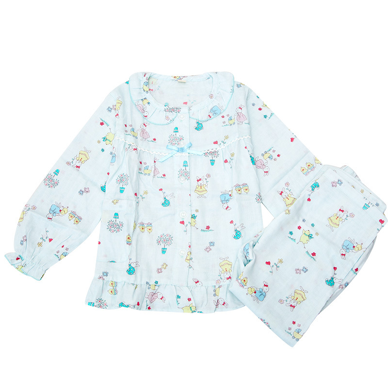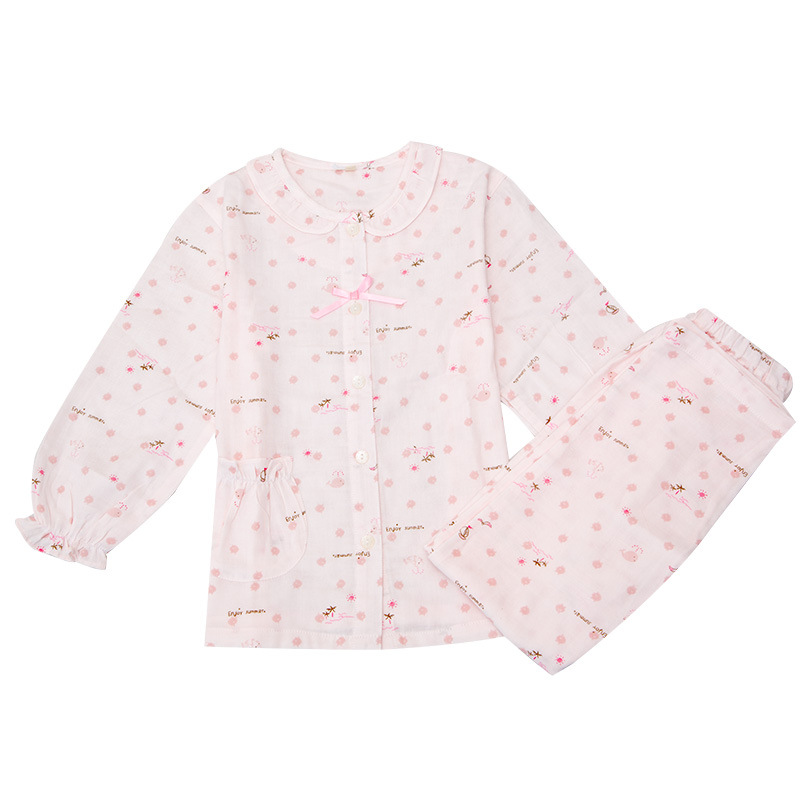 여름 봄과 가을 더블 거즈 반팔 잠옷 세트 여자 가정 옷 귀여운 큰 아이 세대의 머리카락