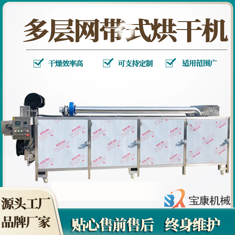 网带式多层烘干机是连续干燥设备,该设备用于透气性较好的片状、条状、颗粒装物料的连续性干燥,对于脱水蔬菜、中药饮片等含水量高而温度不允许高的物料尤为合适;