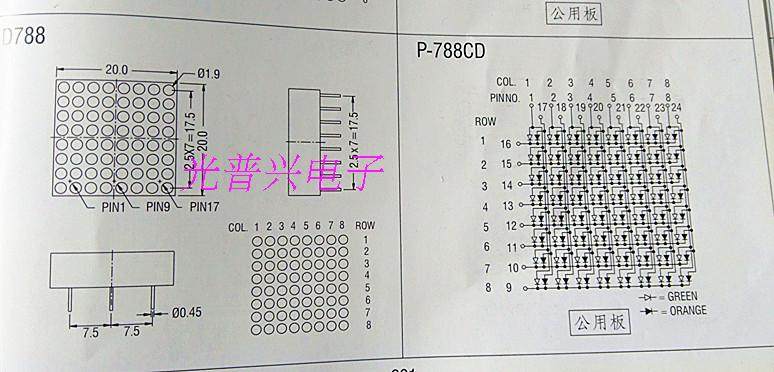 LED数码管 点阵模块 1.9mm 8*8 高亮红绿双色 3排脚 788AS 788CD