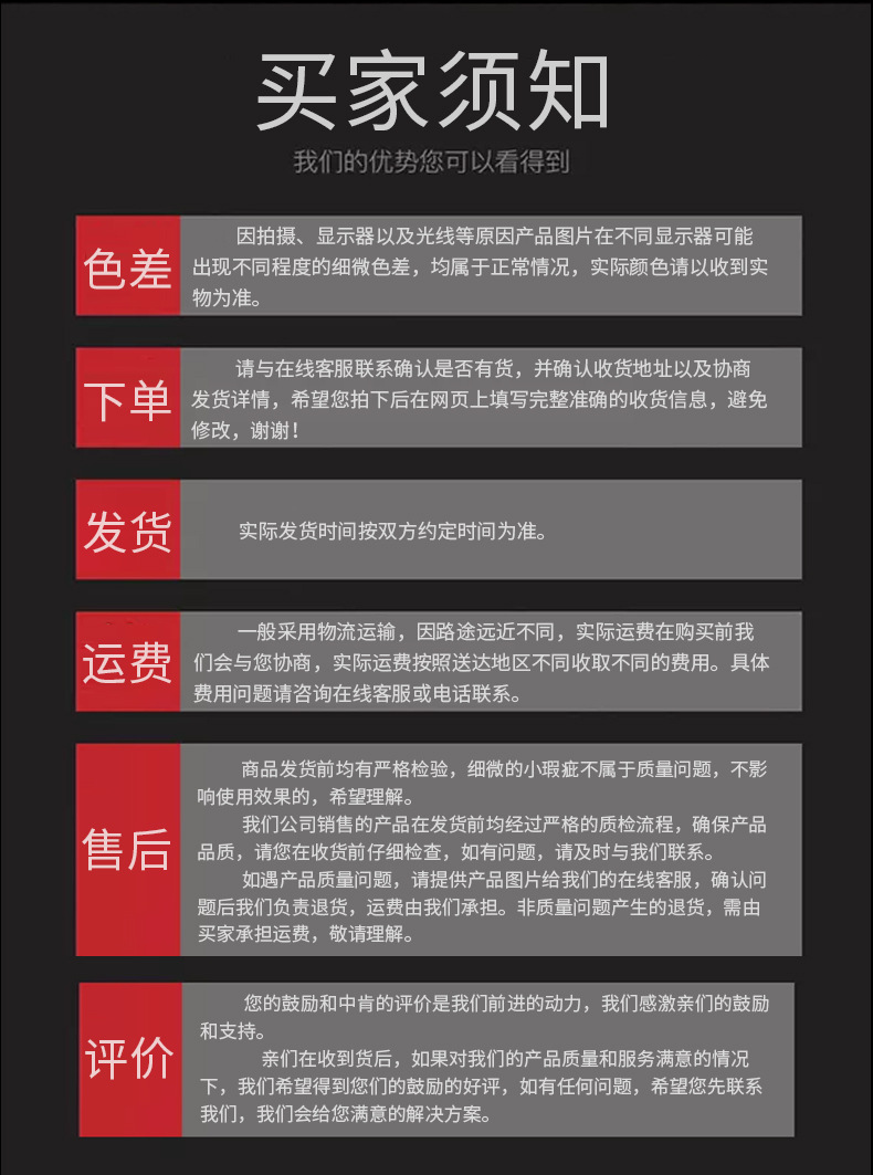 亲爱的顾客,感谢您的关注与支持,为了我们能够更好的沟通和拥有愉快的交易,请购物前多花几分钟看看下面的文字,祝您购物愉快!
