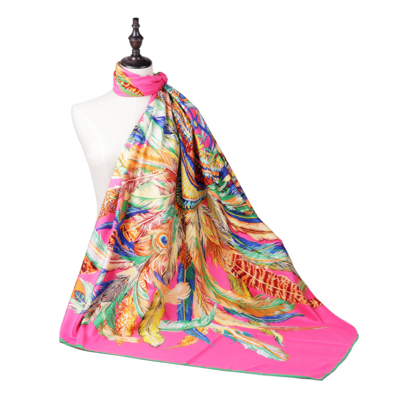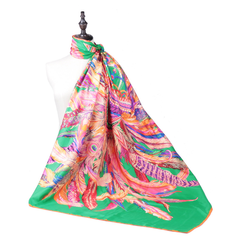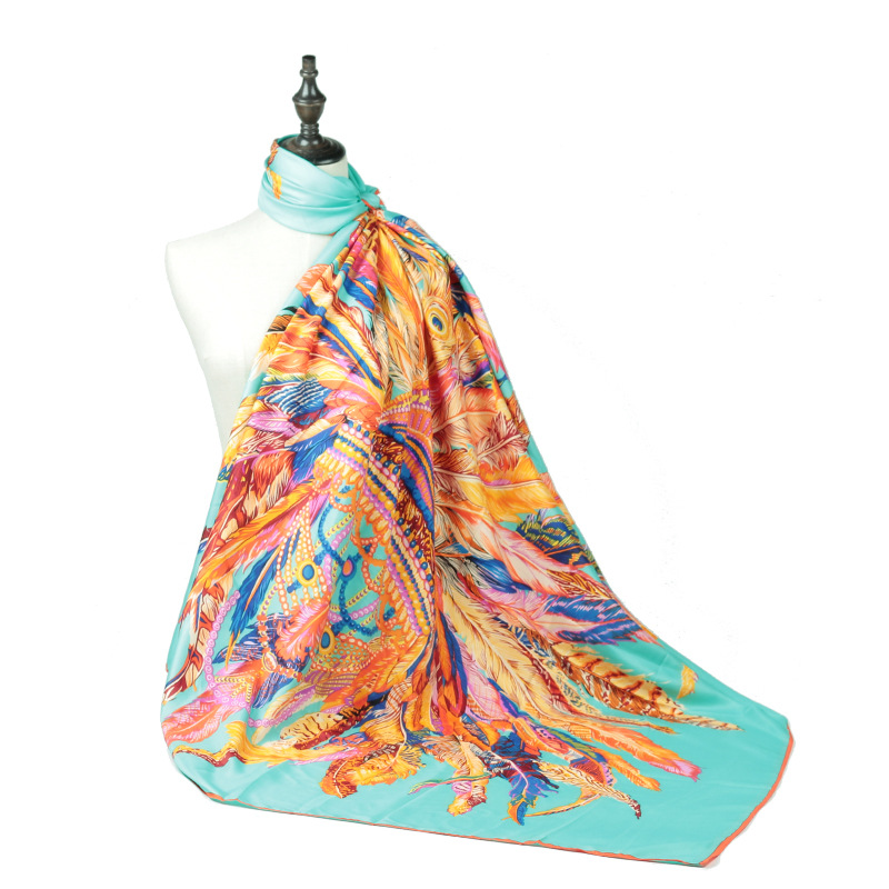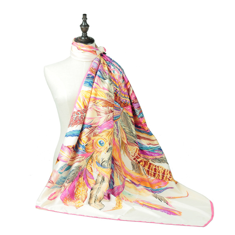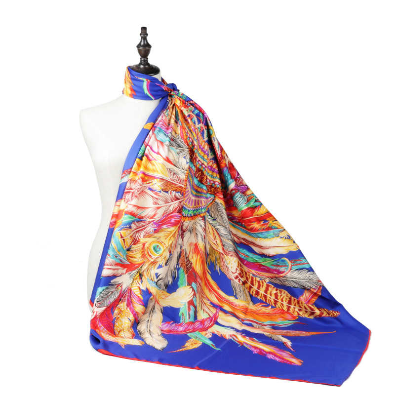 Gaohe 실크 스카프 인도 깃털 크라운 인쇄 큰 사각형 스카프 130*130cm 실크 스카프 여성용 스카프스토어 가기
