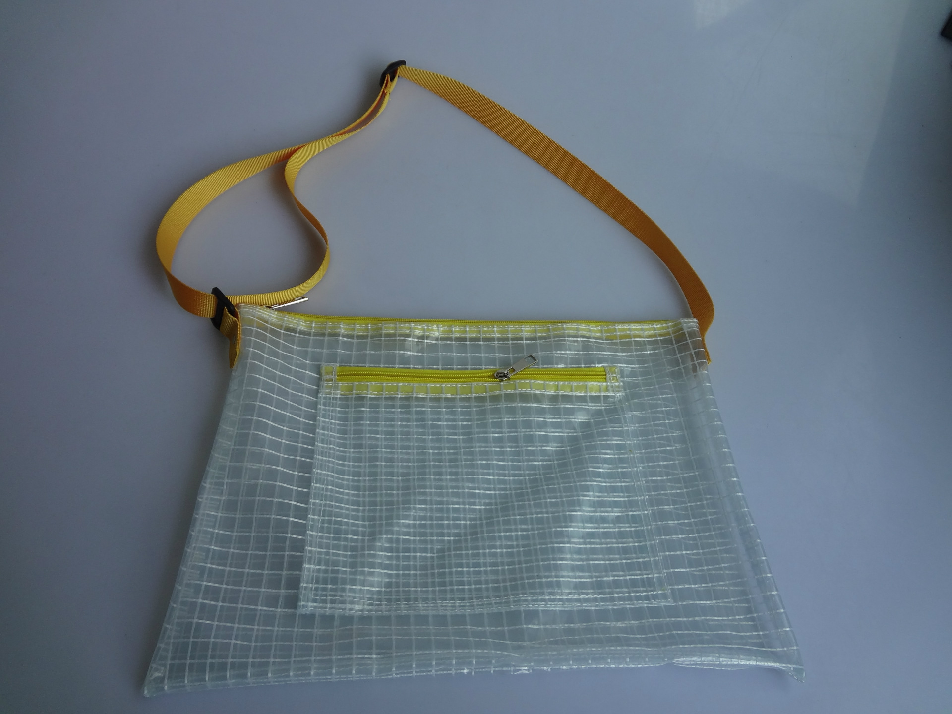 这款无尘电脑工具包的尺寸是长35CM*宽25CM。前面有一个23cm*13cm的口袋,面料是50S的网格(加厚了),防静电可以达到10的8次。前袋和主袋上都是黄色的5号拉链 , 各有一个拉头。背带2.5CM宽2CM长,侧面背带到底部有十字叉固定(承重能力加强)还有加固钉,各有一个三档扣和二档扣可以调节长度。