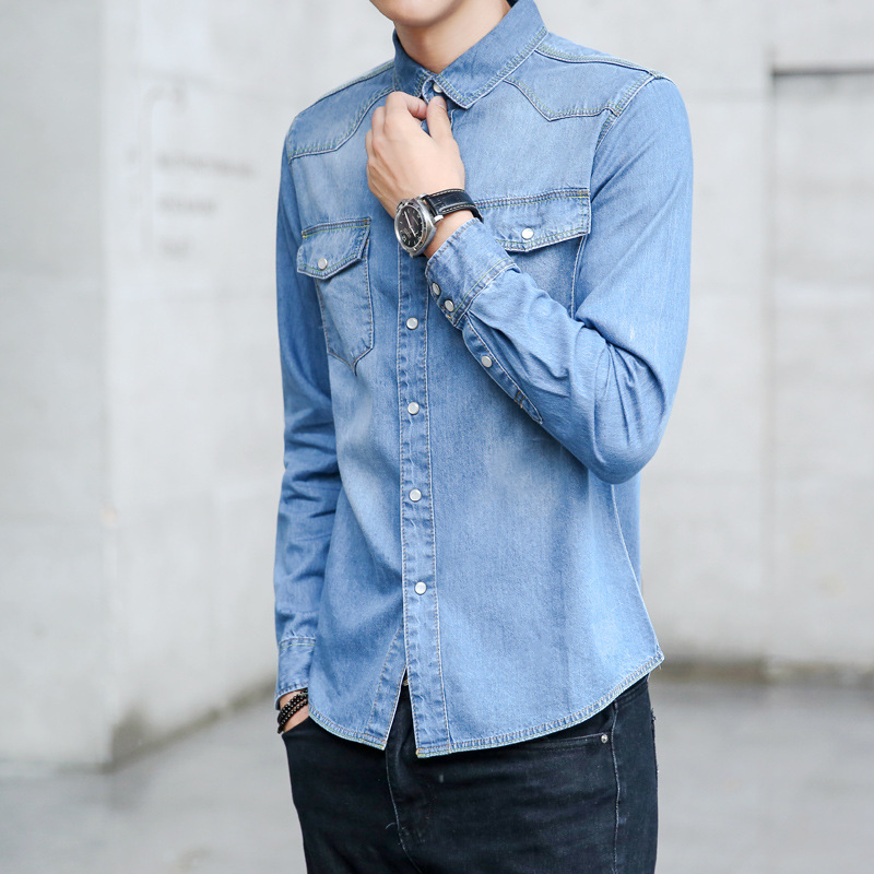 봄과 가을 남자의 데님 셔츠 한국 패션 슬림 긴 소매 셔츠 남자의 새로운 면 데님 도매스토어 가기