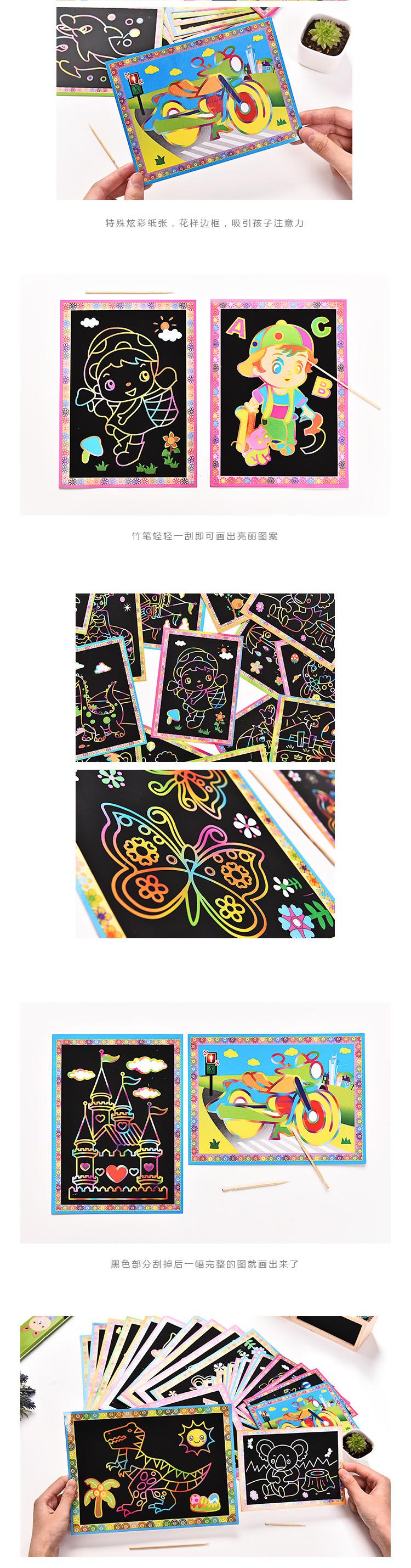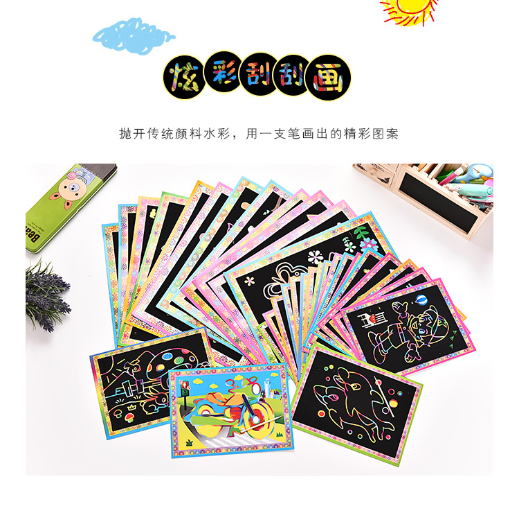刮画纸是一种新颖独特的绘画材料,它很好的结合多种绘画特点,让原本复杂的过程变的简单安全,刮画纸颠覆了已往用笔在纸上绘画的传统,很好的结合版画的特点加以设计,创造出用竹笔在纸上刮画的效果,安全性大大被提高,适合各个年龄层的学生,让老师可以放心大胆的使用,学生也可以无限的相像,很好的促进教学的氛围大大的提高教学成果。