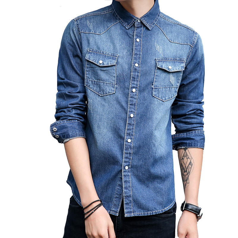 대외 무역 국경 봄과 가을 한국 스타일 슬림핏 세탁 남성 청바지 긴 소매 셔츠 청소년 셔츠 재킷 AliExpress