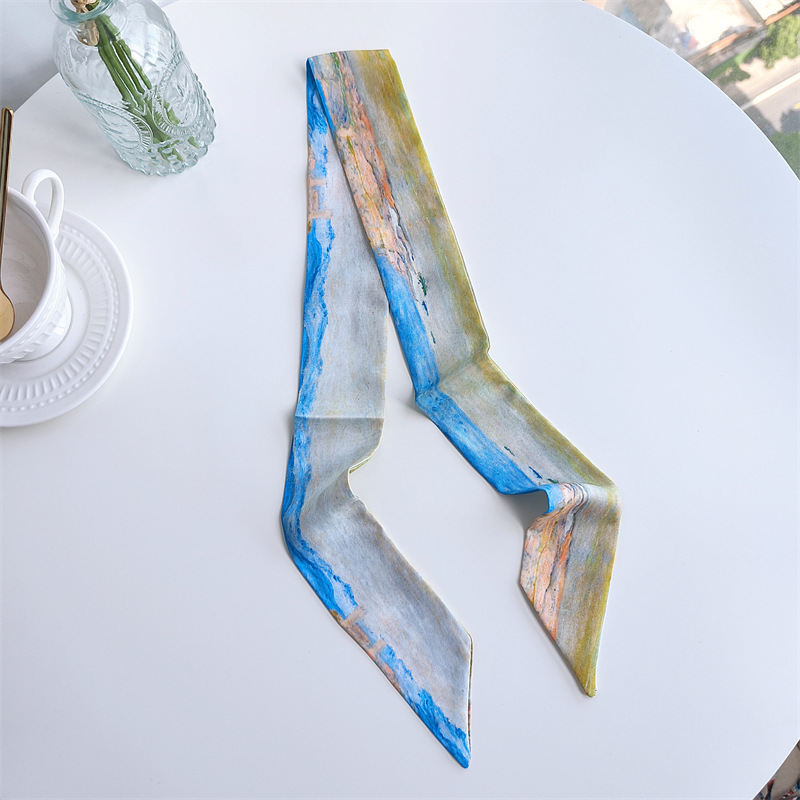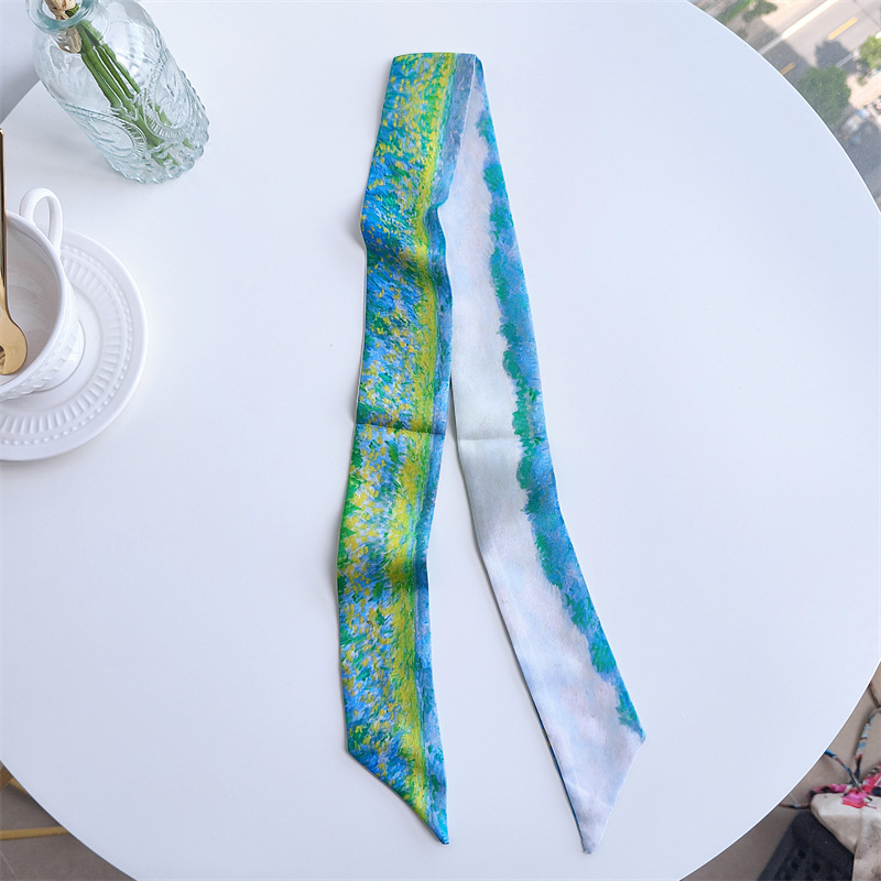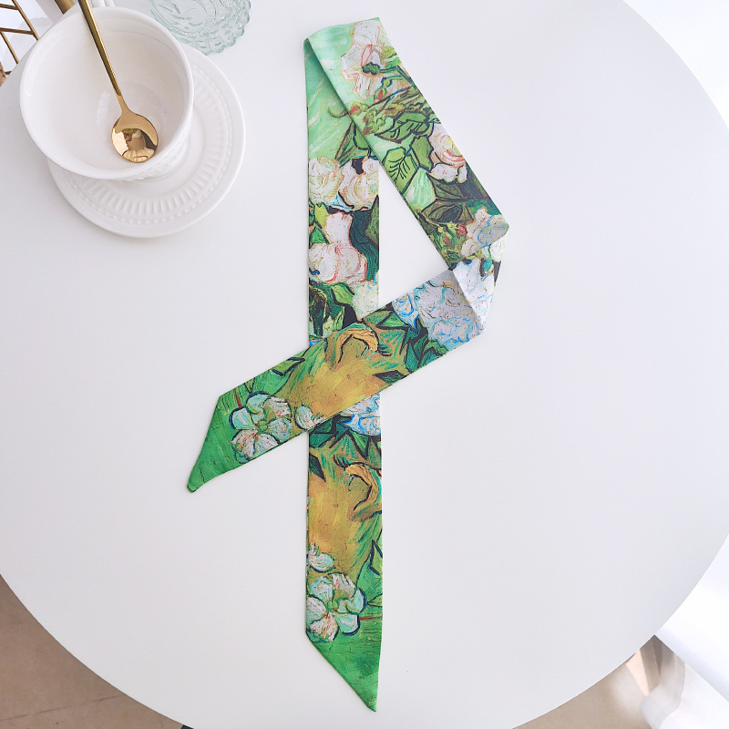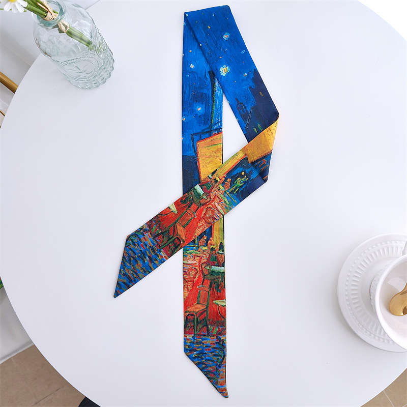 아트 반 고흐 밀 필드 살구색 꽃 별이 빛나는 하늘 유화 얇은 스트립 좁은 리본 넥타이 가방 핸들 실크 스카프 머리 스카프