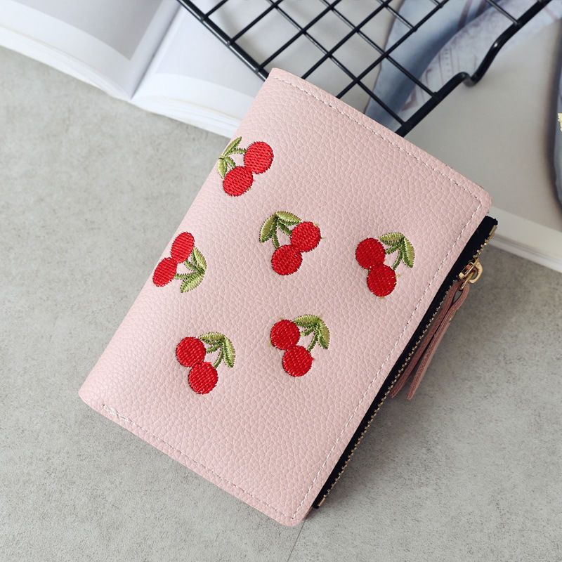 女式竖款搭扣樱桃绣花短款潮流小钱夹 2017新款学生简约时尚钱包undefined