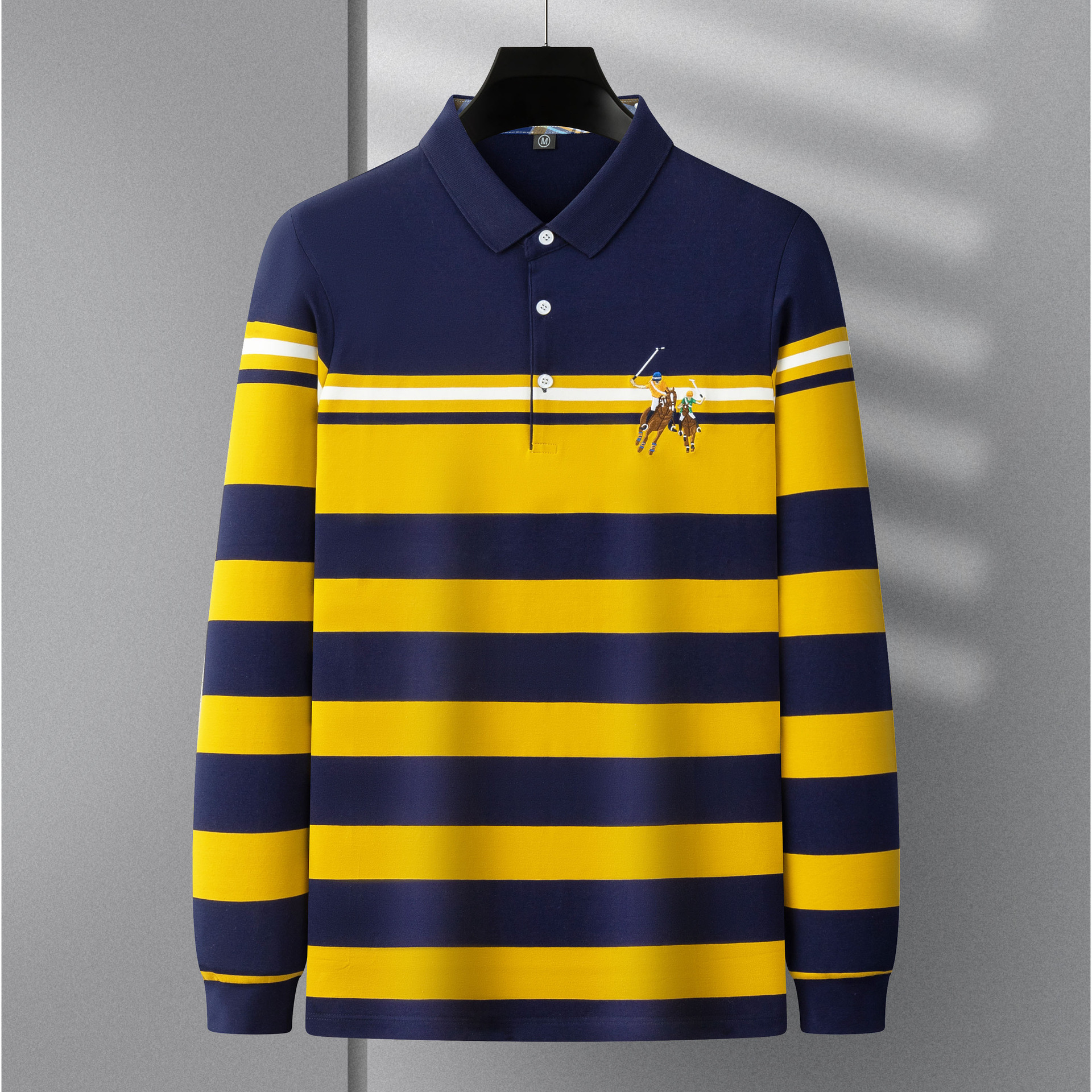 Shenglifa 2025 봄 신작 티셔츠 남성 긴팔 남성 티셔츠 중년 및 노인 패션 옷깃 브랜드 스트라이프