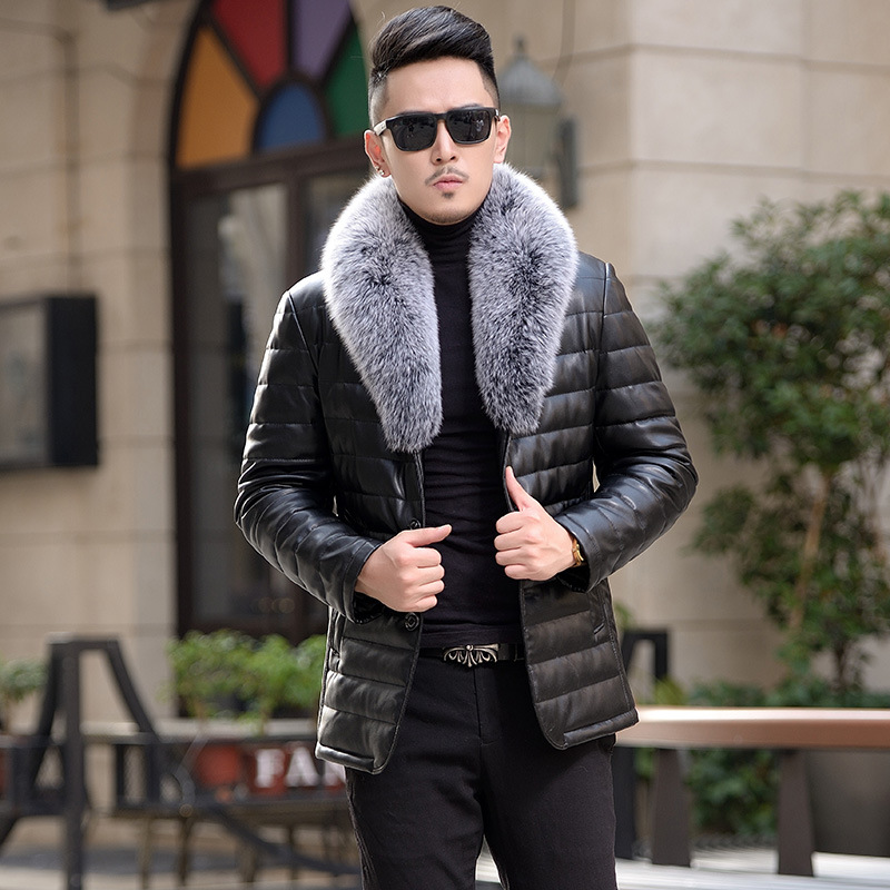 1707 겨울 새 증오 가죽 다운 재킷 남자 실버 폭스 모피 칼라 한국 중간 길이 슬림 핏 가죽 자켓 코트