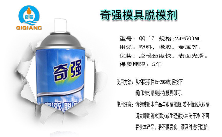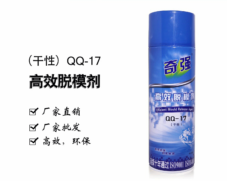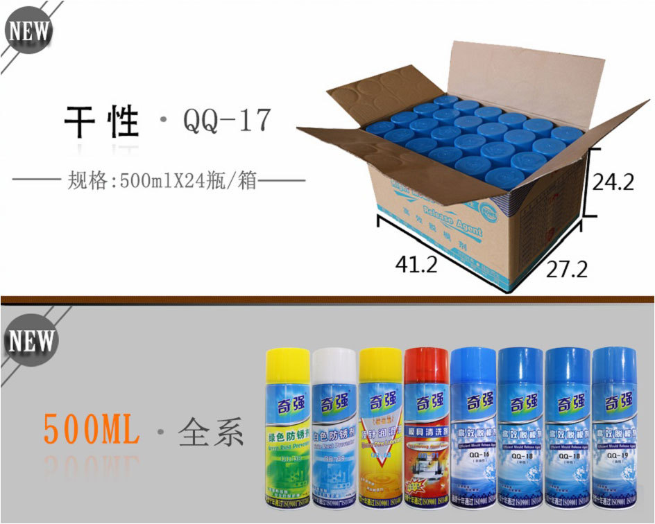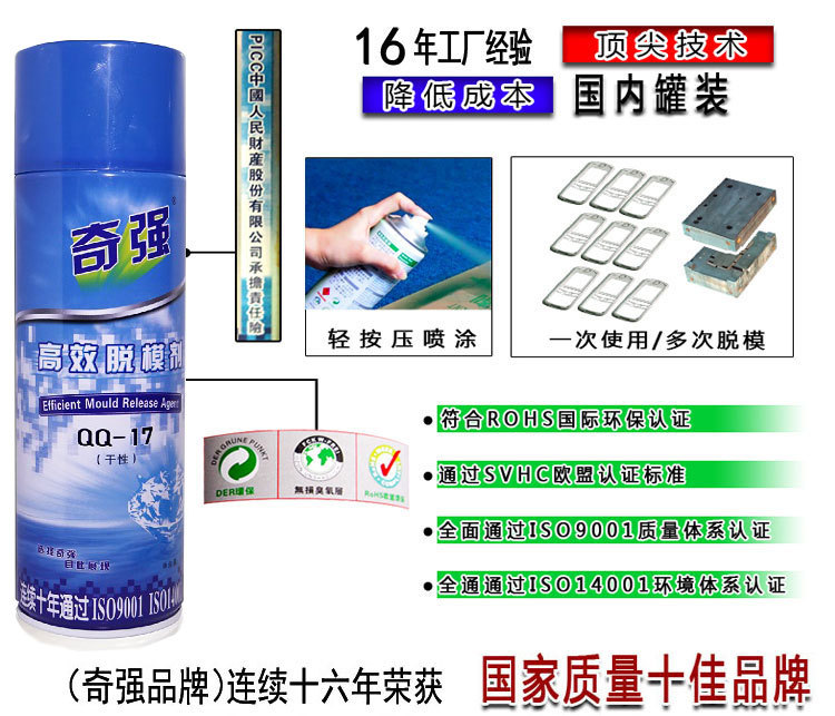 干性高效脱模剂 产品型号:(QQ-17) 产品用途:基本适用于所有塑料产品在注塑时离模。
