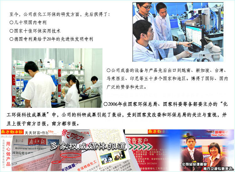奇强公司1998年成立以来一直立足于“技术立业”的企业定 位,取得了一系列拥有完全自主知识产权的科研成果,博得了国际、国内的广泛 赞誉和关注。公司除拥有自己的研发技术团队外,更与国内外的环境科研院所建 立了多方位的合作关系。集团公司的董事长、技术研发负责人被授予“突出贡献的青年专 家”、美国水环境协会会员.