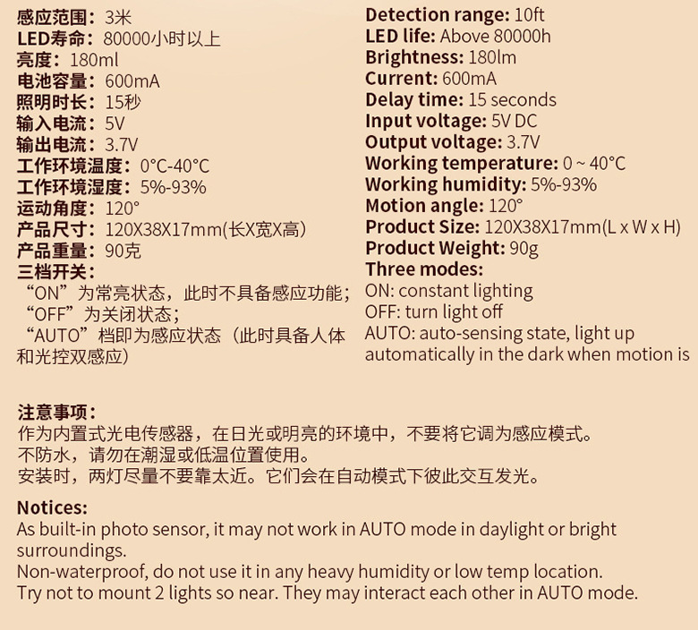 PIR Motion & light sensor: At dark place, it will light up automatically when you get into 10ft detection range, and auto go out 15 seconds after you get out of the range;