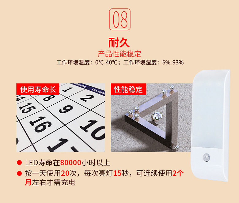 4、按一天使用20次,每次亮灯15秒,可连续使用2个月左右才需充电