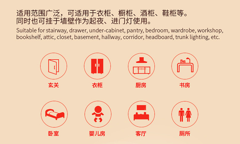 适用范围极为广泛,可适用于衣柜、橱柜、酒柜、鞋柜等。同时也可挂于墙壁作为起夜、进门灯使用