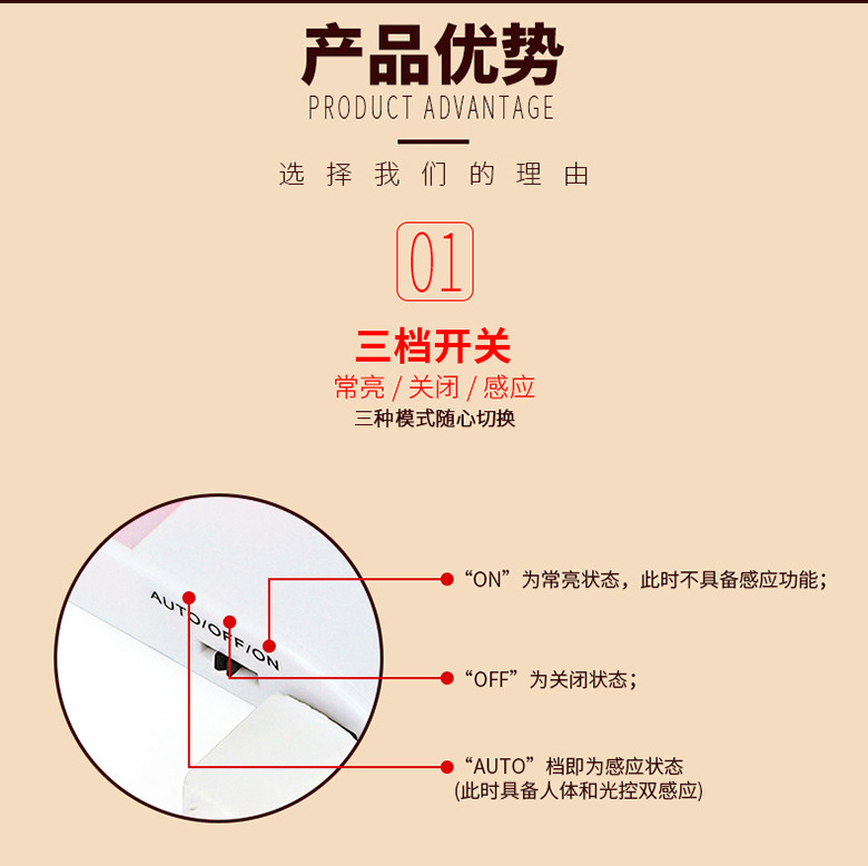 AUTO: auto-sensing state, light up automatically in the dark when motion is