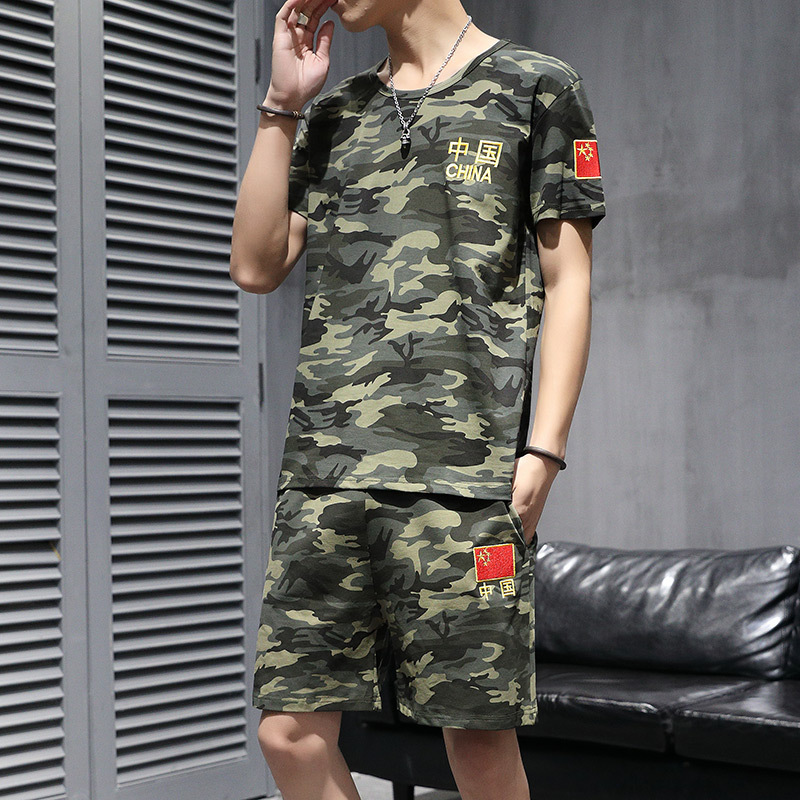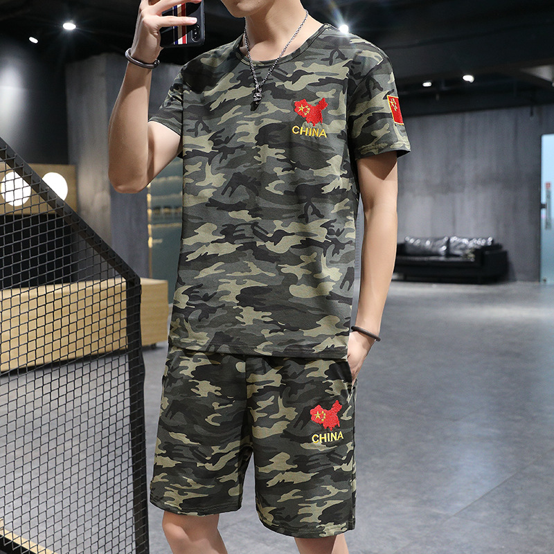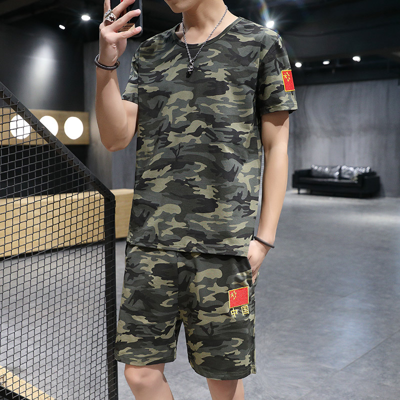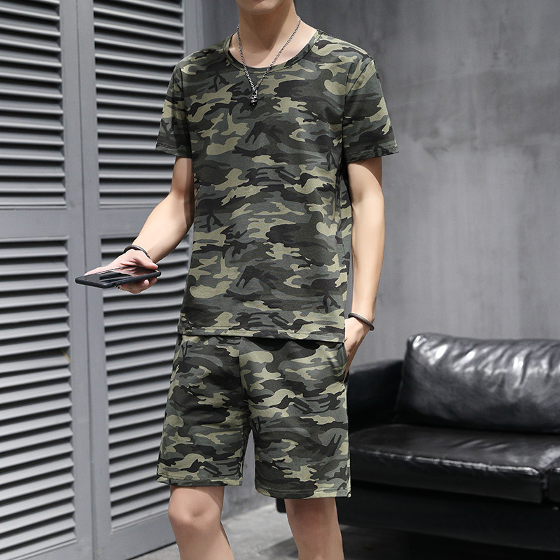 남자의 반팔 위장 티셔츠 반바지 투피스 세트 캐주얼 스포츠 트레이닝복 남자 티셔츠 5 피스 바지 세트스토어 가기