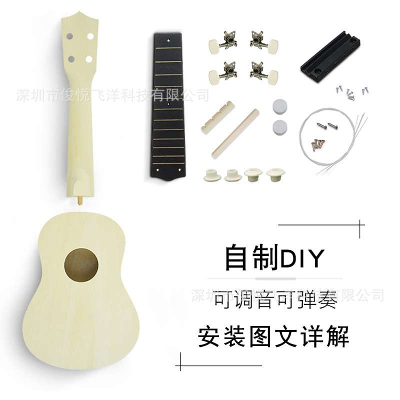 1*箱体(椴木);1*琴颈(椴木);1*指板(塑料);1*琴码(塑料);1*上枕(塑料);1*下枕(塑料);4*琴弦(尼龙);2*音点;4*琴钮;4*琴钮螺母;8*琴钮螺丝;2*琴码螺丝;