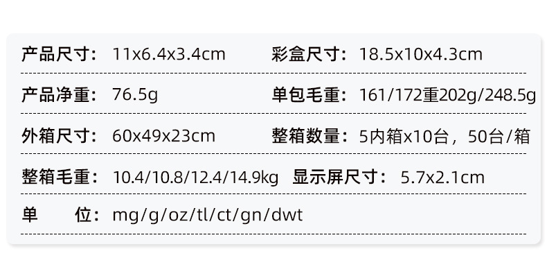 单位切换:mg/g/oz/tl/ct/gn/dwt