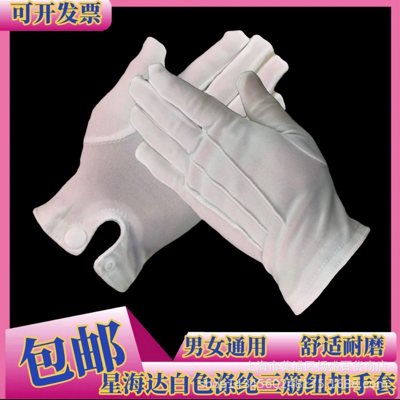 星海达白色涤纶32针涤纶三筋纽扣礼仪手套、采用高品质的32针涤纶面料,柔软舒适,透气性强。耐磨性强,手套背部设有三根筋,手指上沿条、手腕部位按装纽扣,大大增强手套的美观度,另外这款手套适合男女人群,满足不同手型需求。产品适用于开车.礼仪.作业.表演.婚庆,交通指挥.舞台表演,学生军训,办公室、售楼部,跳广场舞,工厂劳动等场所,提供舒适的使用效果。另外这款手套支持七天无理由退换,如有需要可开增值税普通电子发票。