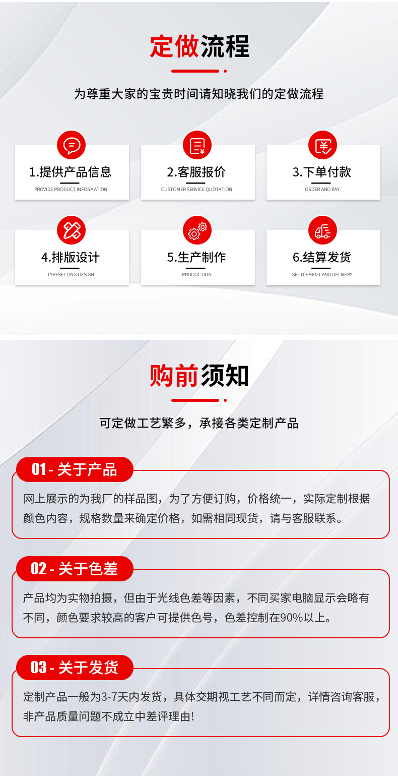 @关于发货:定制产品一般为3天内发货,具体交期视工艺不同而定,详情咨询客服,本店默认中通快递,如需指定快递和物流,可与客服沟通并补齐差价,质量问题退货运费由本店承担,非产品质量问题不成立中差评理由!