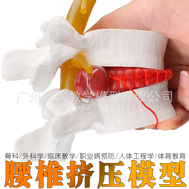 此款模型 采用放大 1.5倍的第四节腰椎和第五节腰椎,椎间盘 脊神经组成,其中椎间盘采用软弹性体,方便使用者演示,腰椎间盘突出,展示了,当人体弯曲和蜷曲的时候,人的椎间盘分发生什么样的变化。