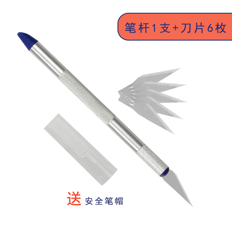 产品:刀柄1支 刀片6把 笔帽一个 刀盒1个