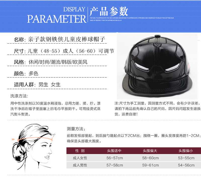 어린이 모자 도매 아이언맨 가죽 어린이 야구 모자 만화풍 유럽 및 미국 힙합 모자 부모-자녀 평챙 모자 대외 무역스토어 가기