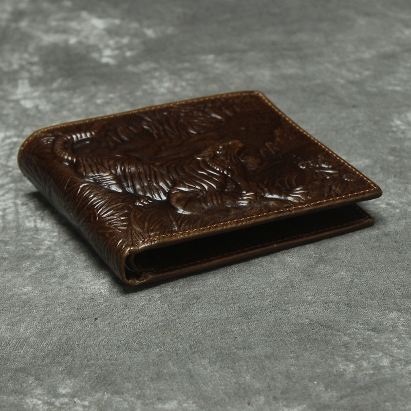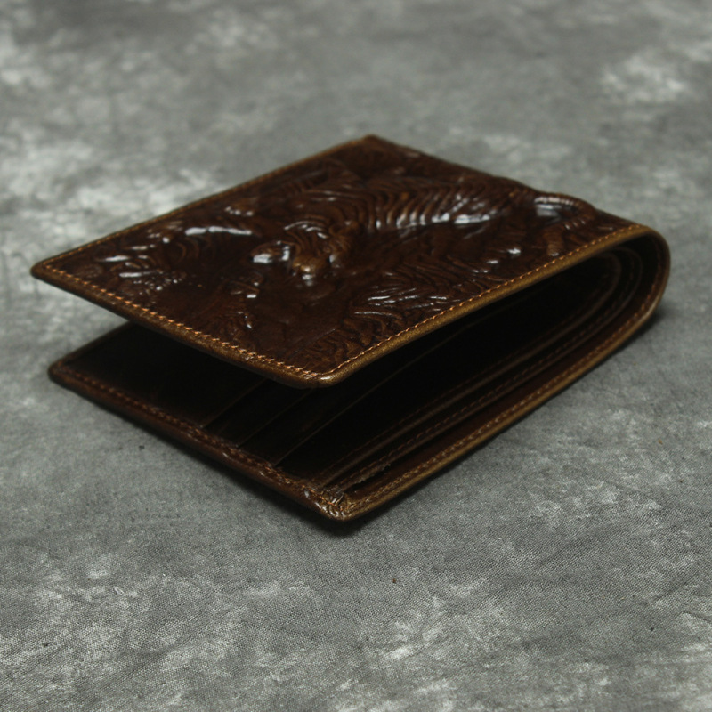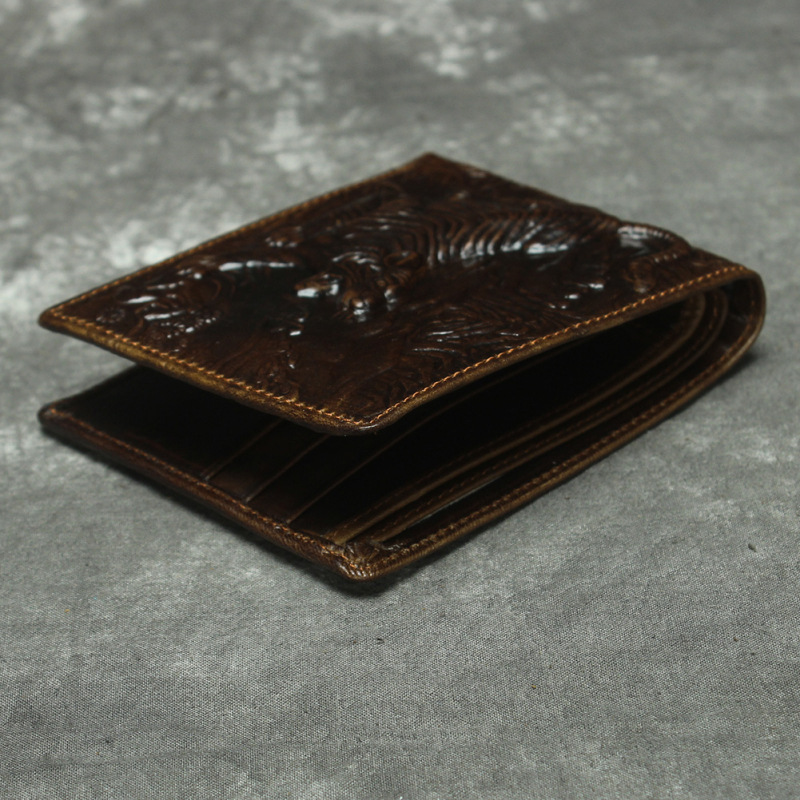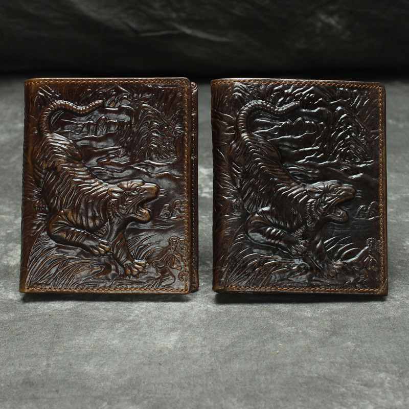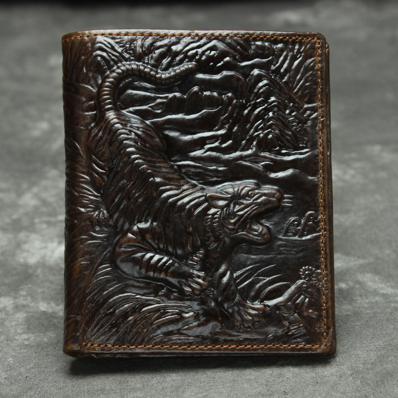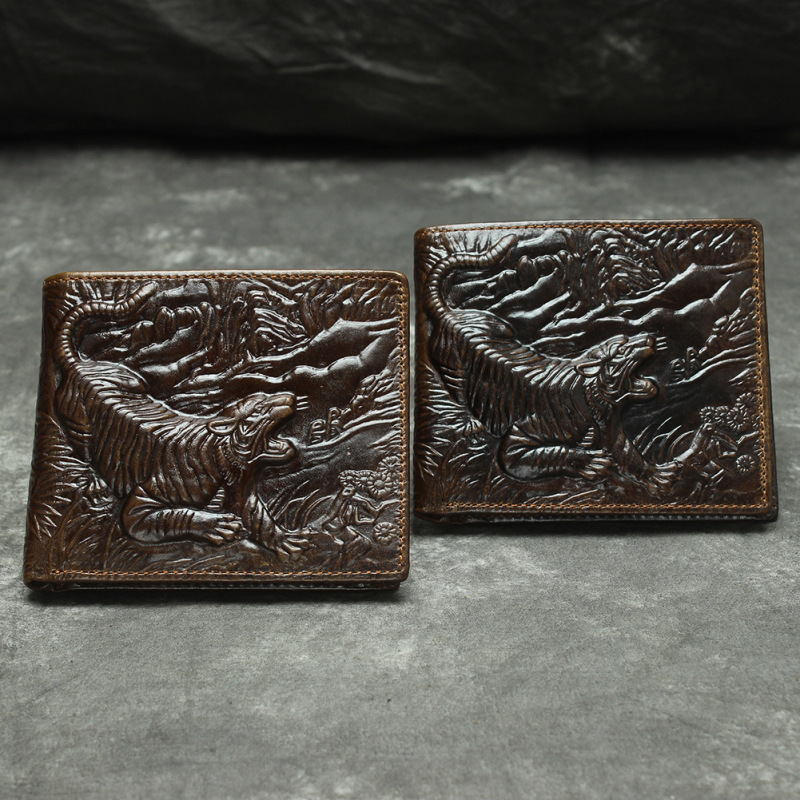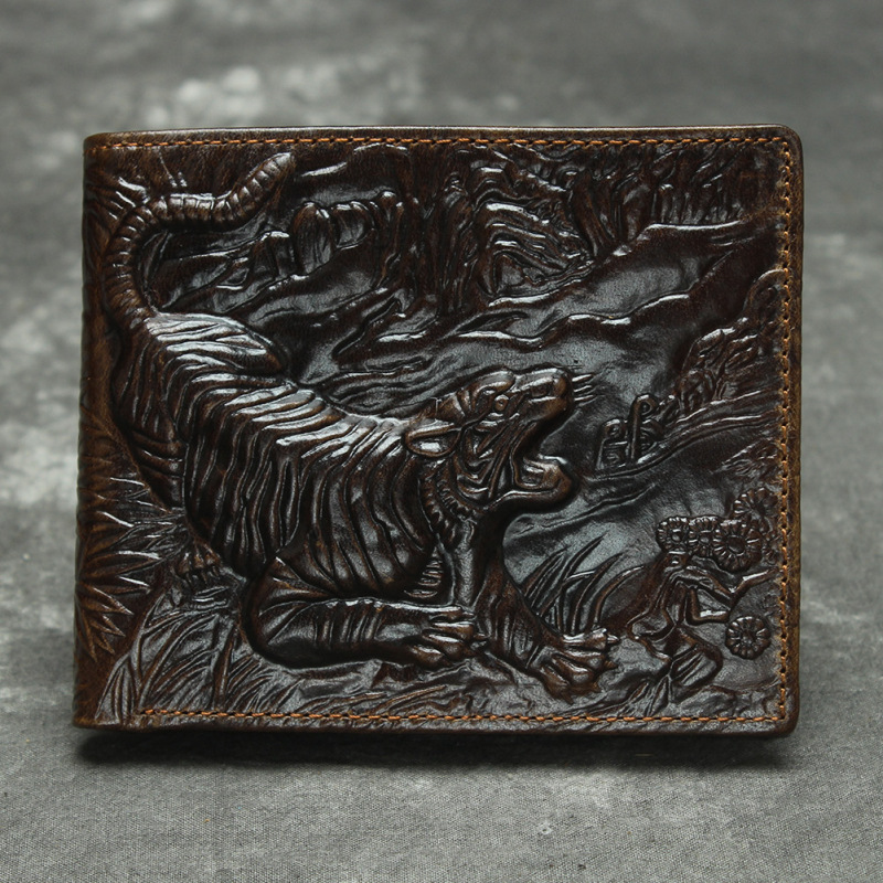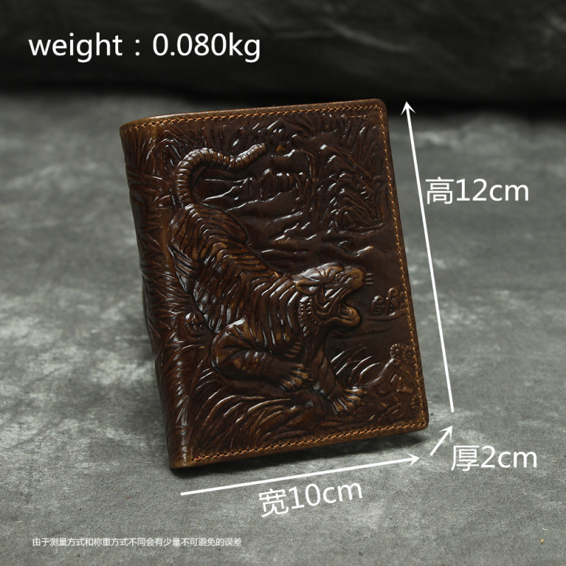 남성과 여성을위한 간단한 오일 왁스 가죽 지갑 정품 가죽 입체 호랑이 패턴 지갑 2-접이식 상단 레이어 소가죽 실버 가방 수평 및 수직