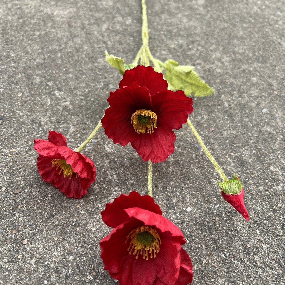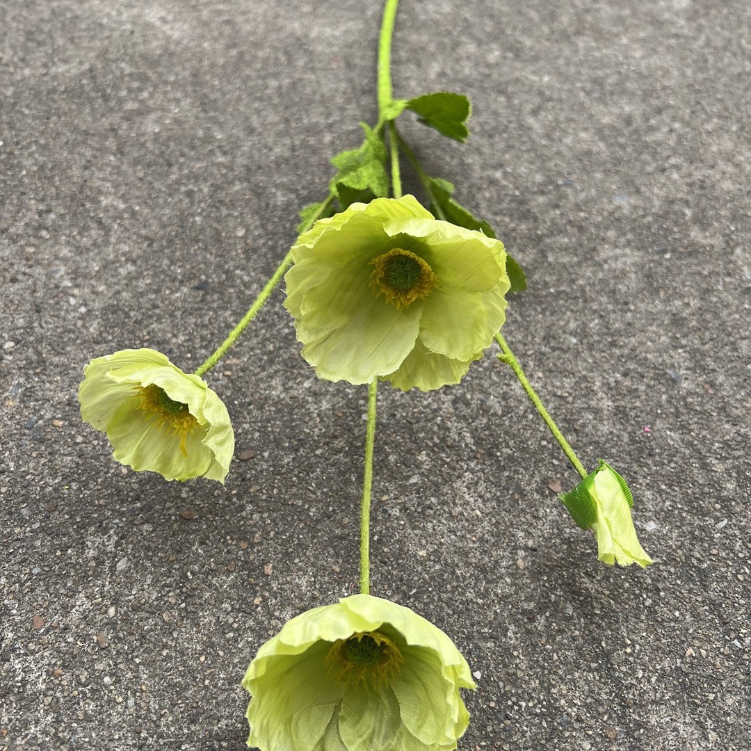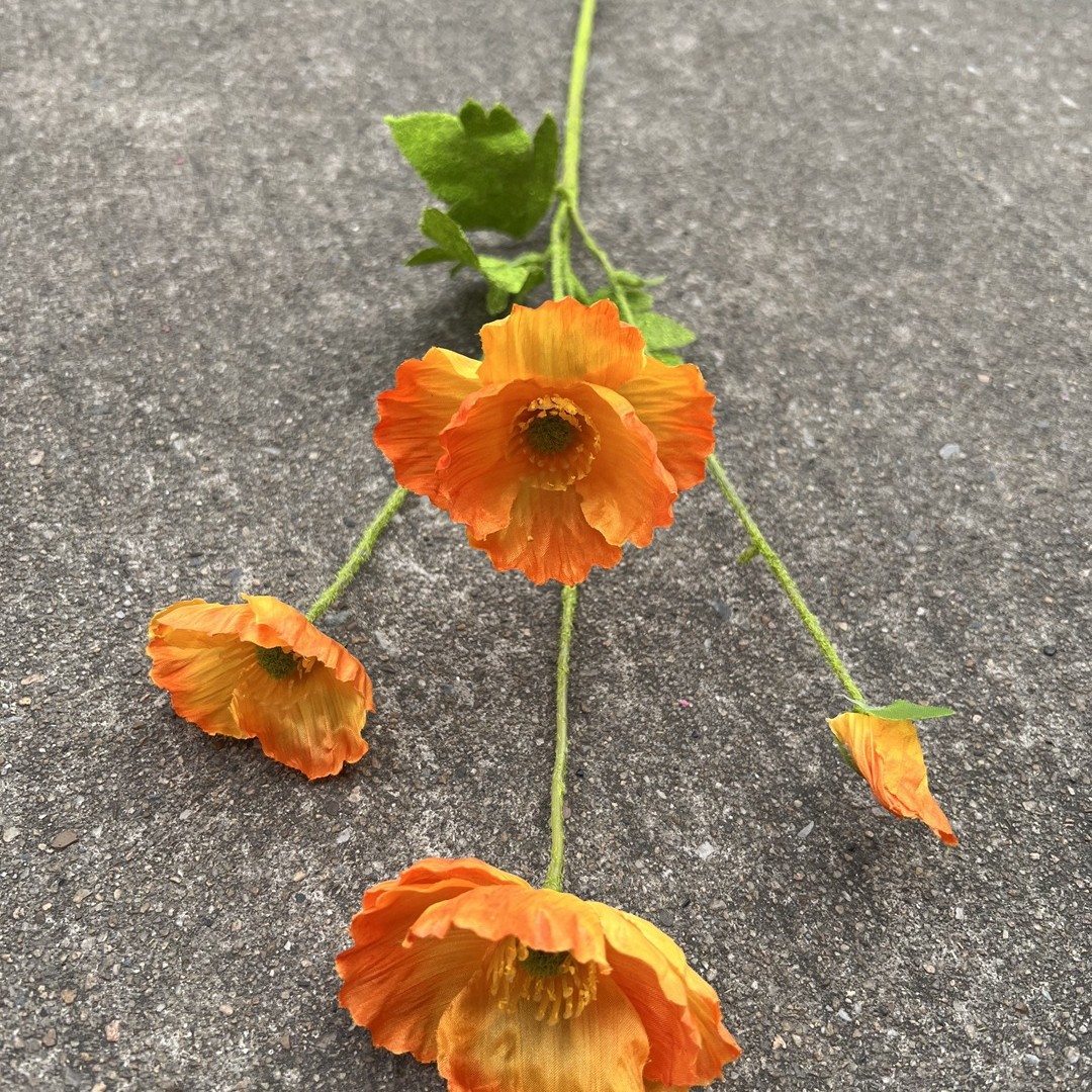【品名】:4头植毛虞美人 【材质】:绢布 【规格】:总长度约58cm,共4个分叉,含3朵花和1个花苞,花头直径约7cm, 植毛杆子,更高仿。叶子若干。 【特点】:田园风格,点缀小花