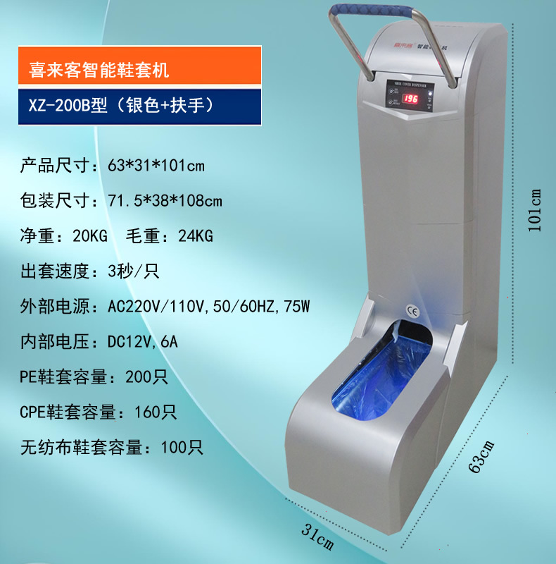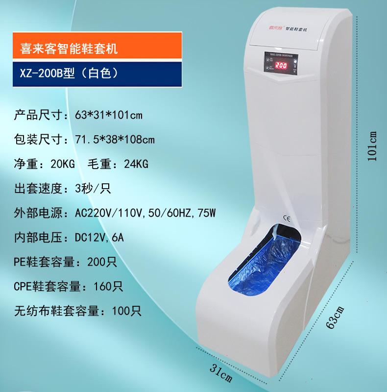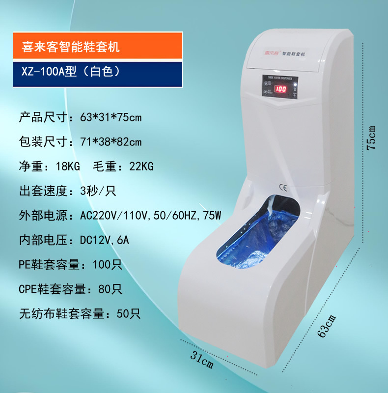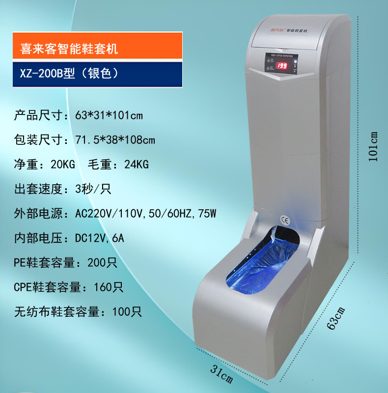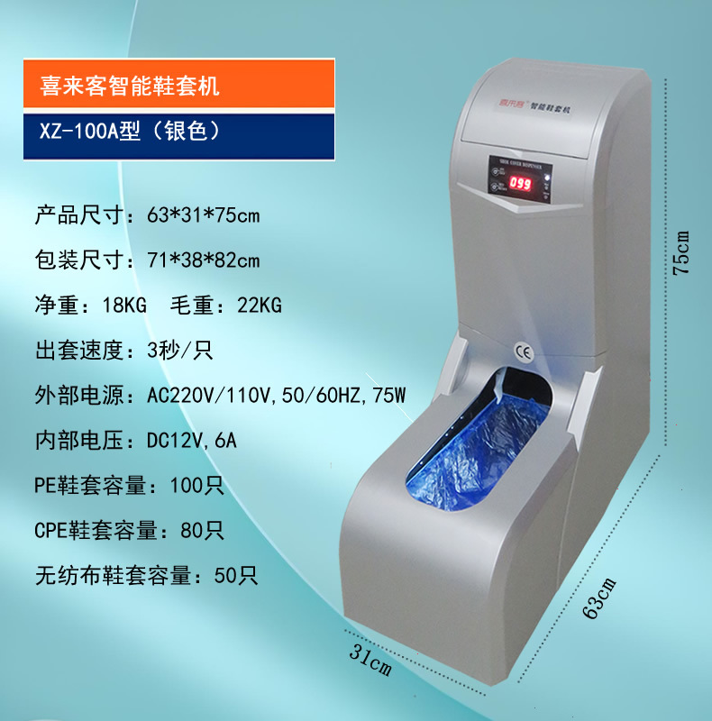7.微电脑操作系统,操作简单,性能稳定。机器内主要由微电脑控制的线路板、显示板、鞋套识别控制板、电机、红外线开关等组成,机器自动工作。无需人手帮助。