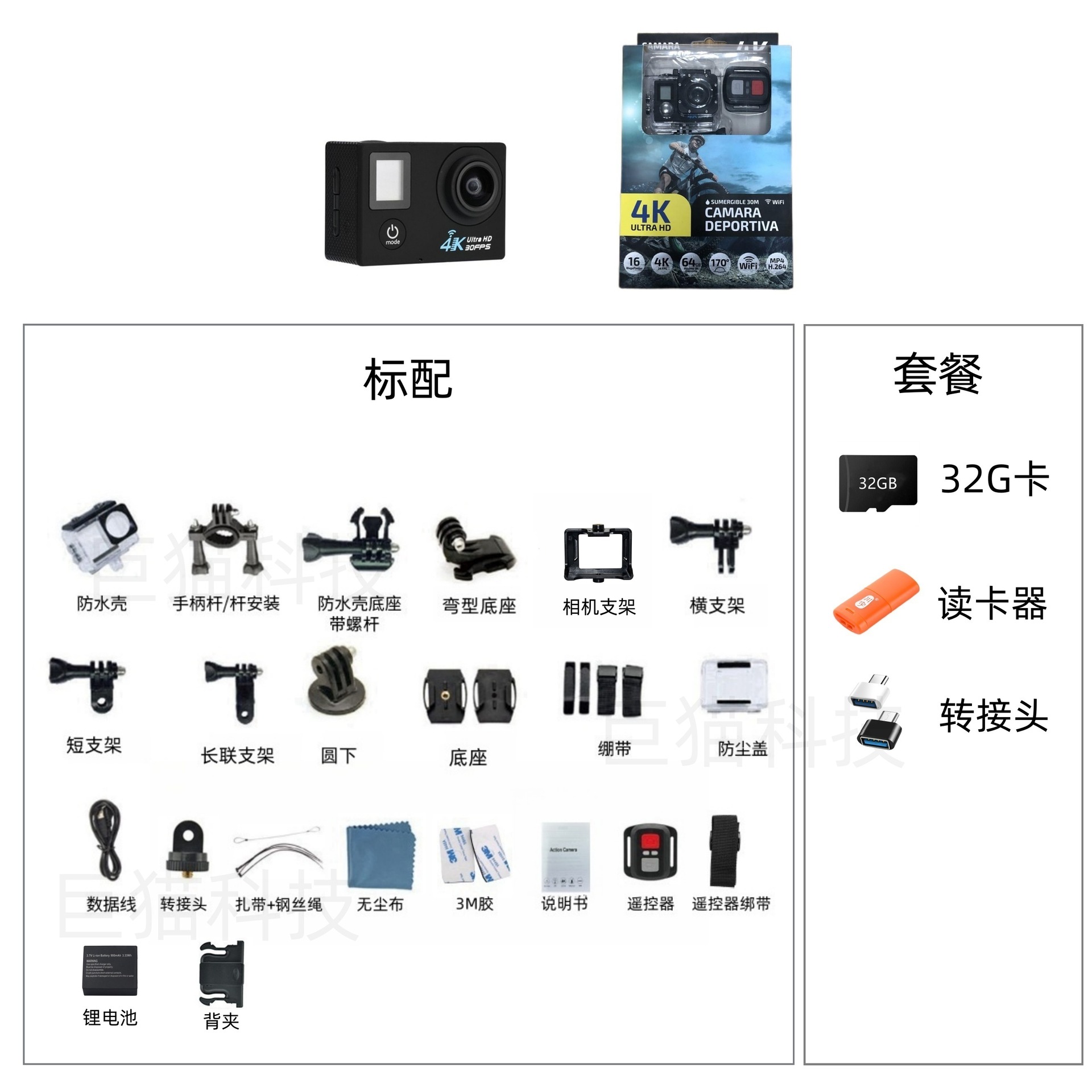 Packing list 包装清单 | 主机*1,防水壳+支架*1,单车支架*1,相机支架*1,头盔座(含3M胶)*2,转接头1*1,转接头2*1,转接头*1,底座*1,数据线*1,录音后盖*1,背夹*1,绑带*,4,扎带*4,擦拭布*1,遥控器*1,遥控器绑带*1,说明书%1,彩盒(含吸塑)*1 |
