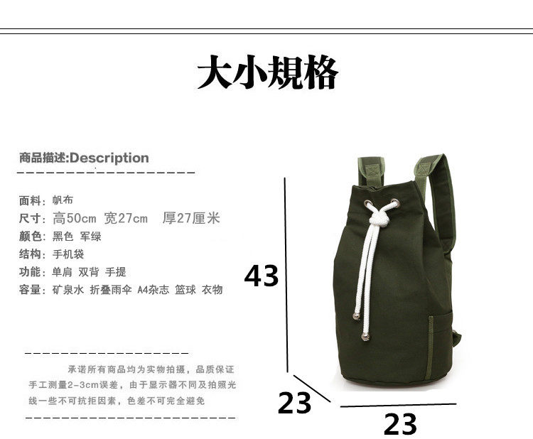 厂家直销,支持大量批发定做,小量混批,质量保证长期有货,有问题请联系客服沟通。欢庆箱包有限公司经营范围:帆布包 女包 男包 双肩包 胸包 单肩包。有自己的线下生产线。拥有完整科学的质量管理体系,产品质量是我们生存的根本,服务至上是我们的宗旨,本公司每个星期都有新品上架,请及时关注! 退换货常见问题:1货物已在物流中,半路有退货不想要的买家,需要承担实际发货运费,请知悉!2因个人原因不想要的【尺寸 颜色选错等问题】需要承担来回运费!3有质量问题需要退换货的请联系客服拍照核实,运费【卖家承担】! 免责声明:快递和物流只是和本公司合作方,所以只能保证发货时间,无法保证到货时间 。所以不承担任何责任,例如:延误开业 延误活动等等的次贷损失 本店图片均实物拍摄,但由于光线 显示器等原因,您看到的图可能会有轻微色差问题