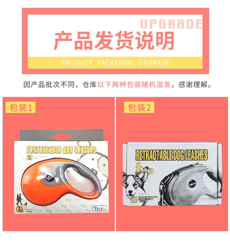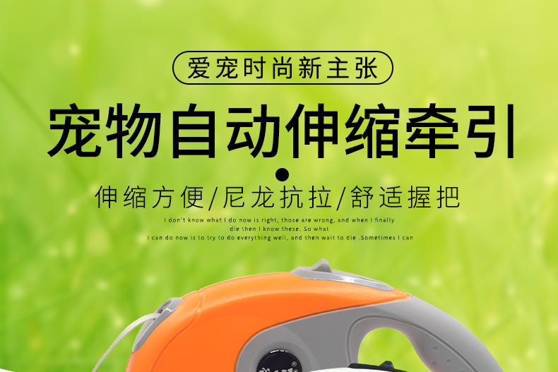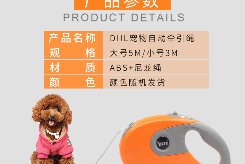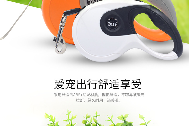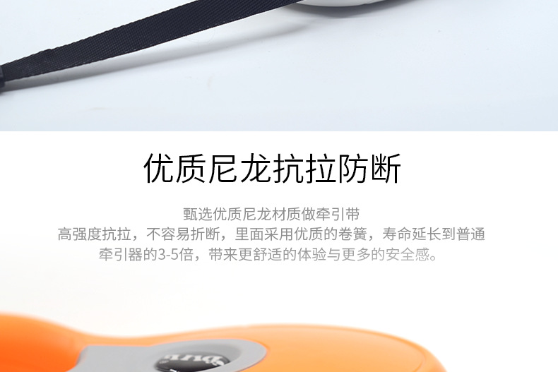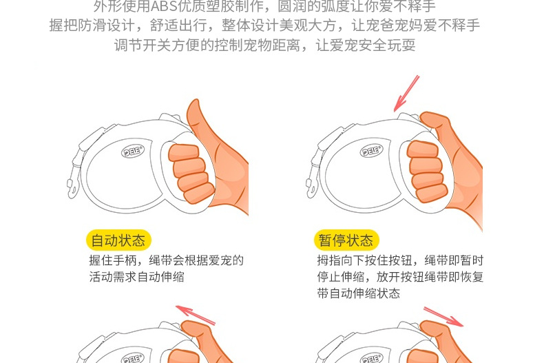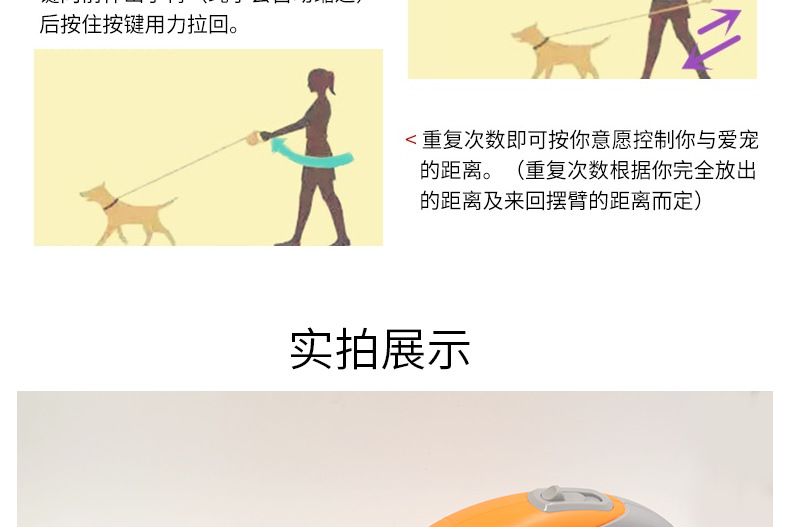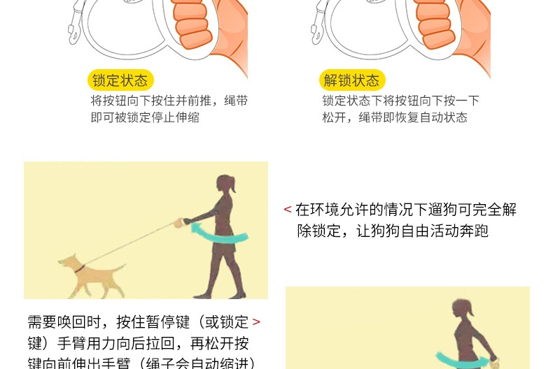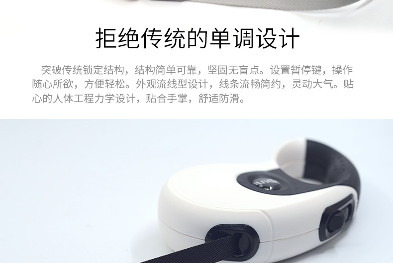 1、一键式按钮控制,操作简单,一推一拉,一按一松,即可操控爱宠活动范围,内部伸缩卷簧使用寿命为3W次以上