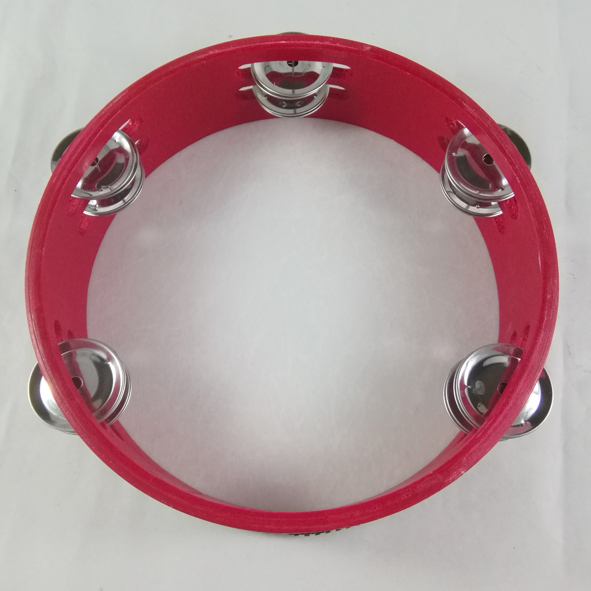 铃鼓是羊皮手鼓的周围装着许多小铜片,用手打击鼓面或摇动鼓身时,小铜片也叮铛地响起来。它也是没有固定音高的。