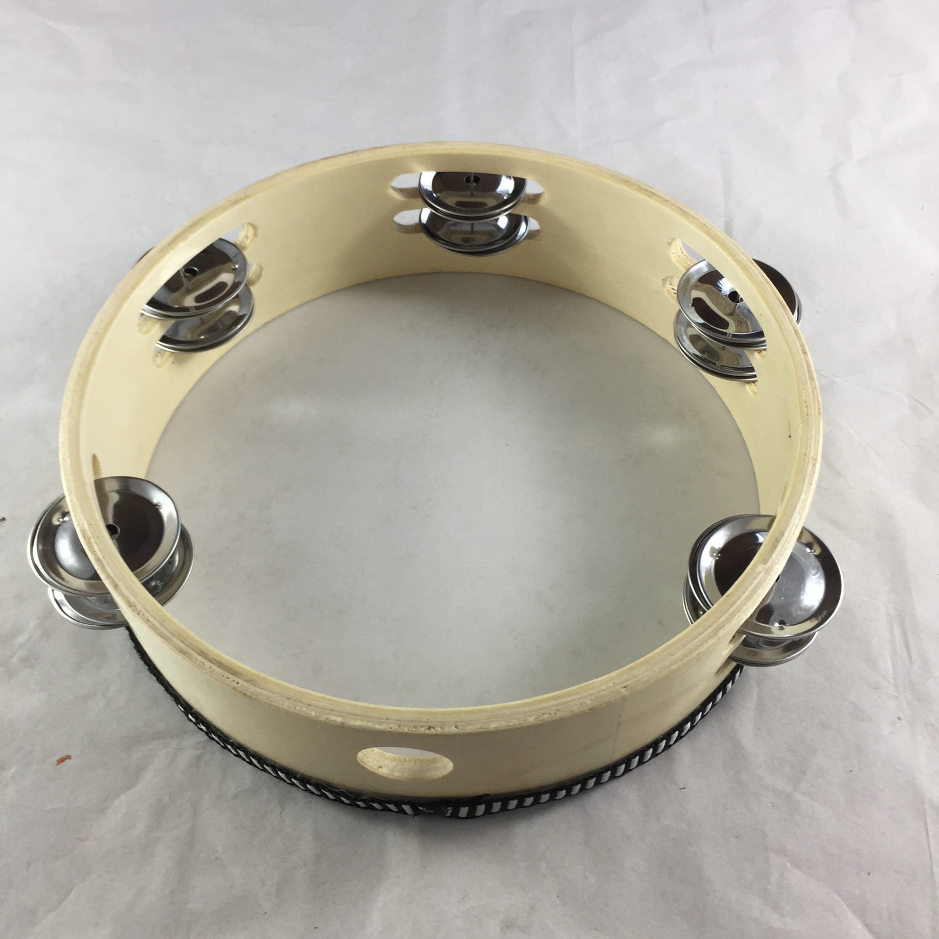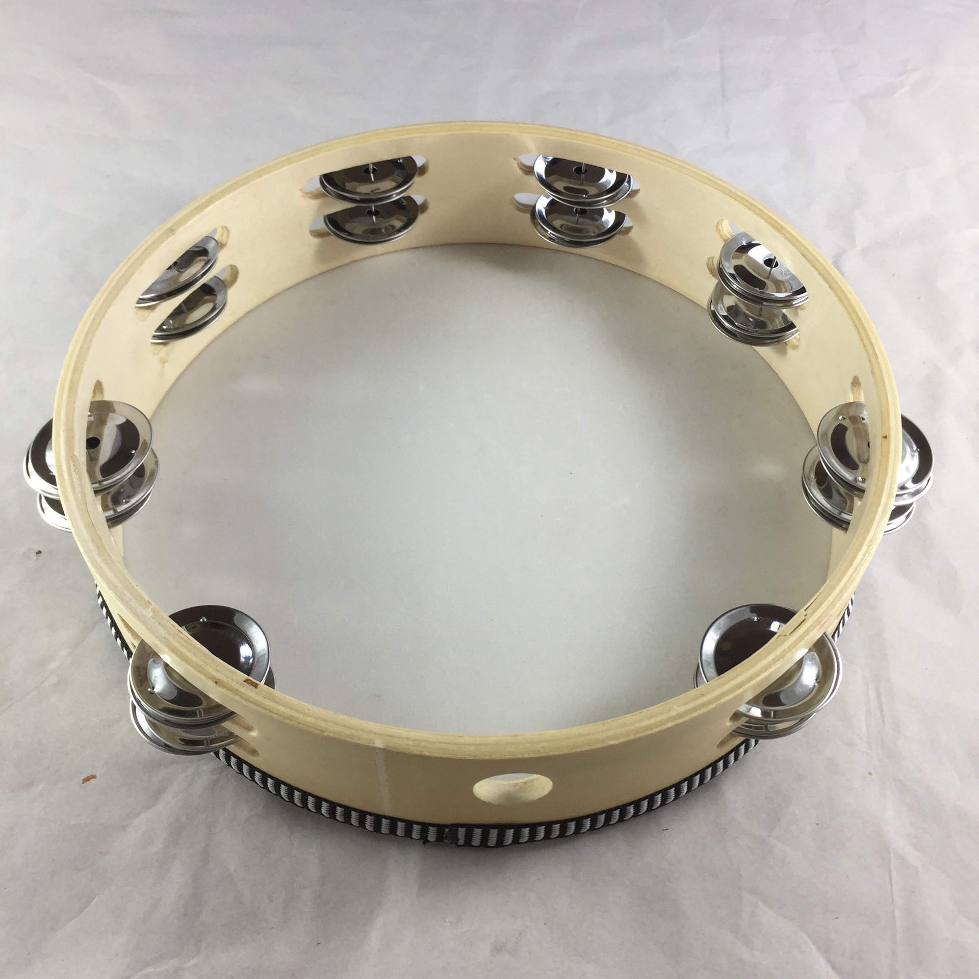 铃鼓是在扁圆形的木制鼓框上,单面蒙以羊皮、马皮或驴皮,皮面周围用铁钉绷紧,鼓框上开有扁圆形小长孔,装有5~7 对铜制或铁制小钹,另有一不装小钹的圆孔作为手握部位。是维吾尔、朝鲜、乌孜别克、塔吉克等族的打击乐器。维吾尔语称“纳格曼达卜(意为“歌唱用的手鼓”),朝鲜语称“平高”。流行于新疆维吾尔自治区及吉林延边等地。